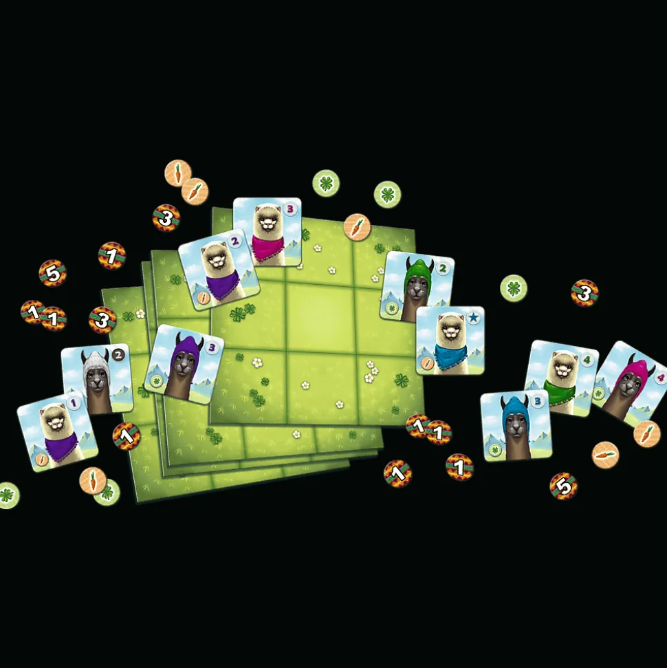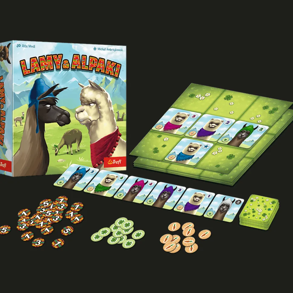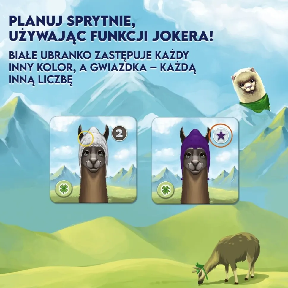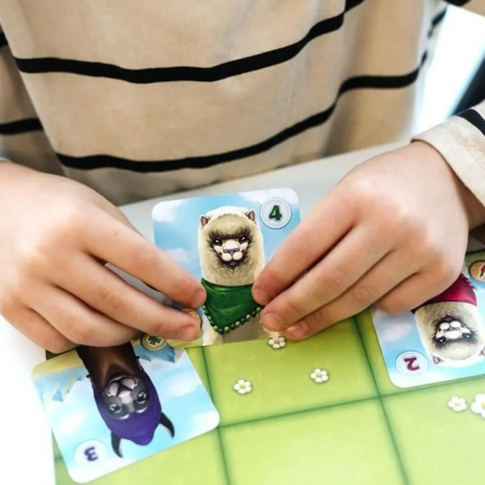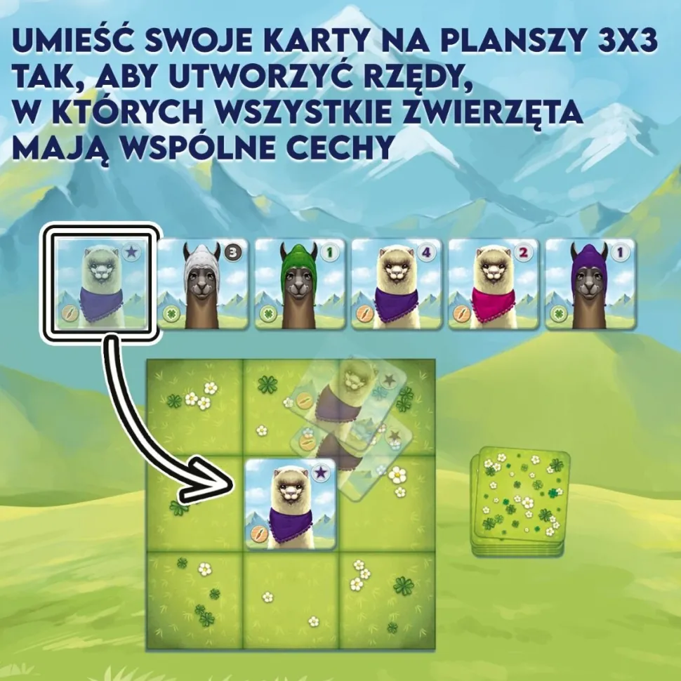 Witajcie na górskich pastwiskach zamieszkanych przez lamy i alpaki! W grze należy rozmieścić na swojej planszetce kolejne karty ze zwierzętami, tak aby obok siebie znalazły się 3 zwierzaki, które łączy wspólna cecha – rodzaj zwierzęcia, cyfra na karcie, lub kolor akcesoriów. Szukaj podobieństw! Im więcej wspólnych cech, tym więcej punktów, które przybliżą Cię do wygranej.