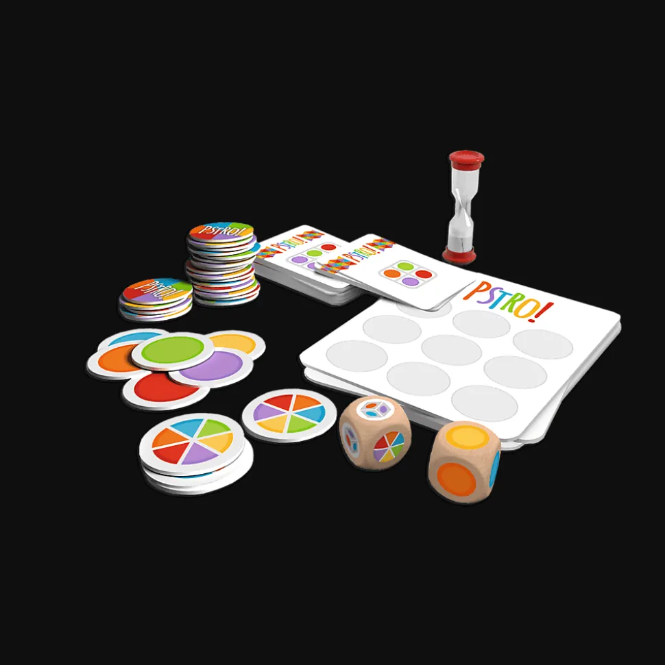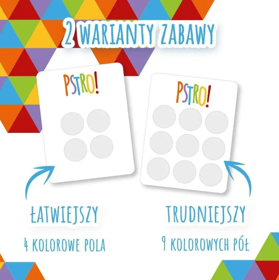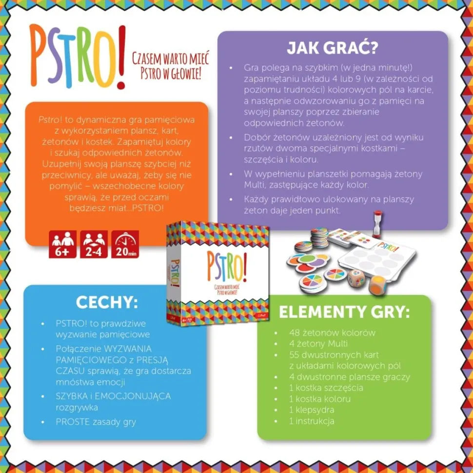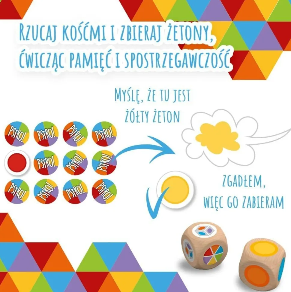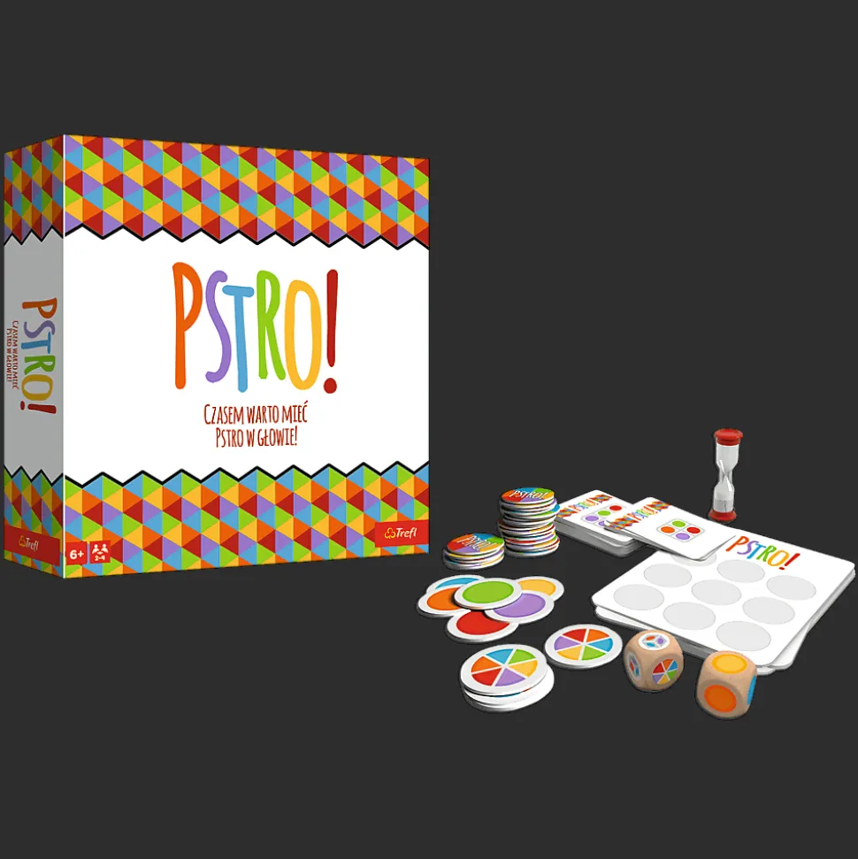 Pstro! to dynamiczna gra pamięciowa z wykorzystaniem plansz, żetonów, kart i kostek. Jej zasady są tak proste, że wystarczy chwila rozgrywki, żeby je poznać bez zagłębiania się w instrukcję.