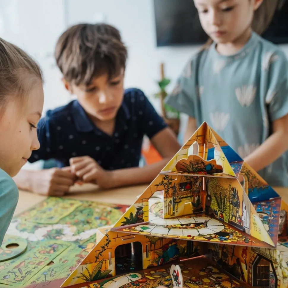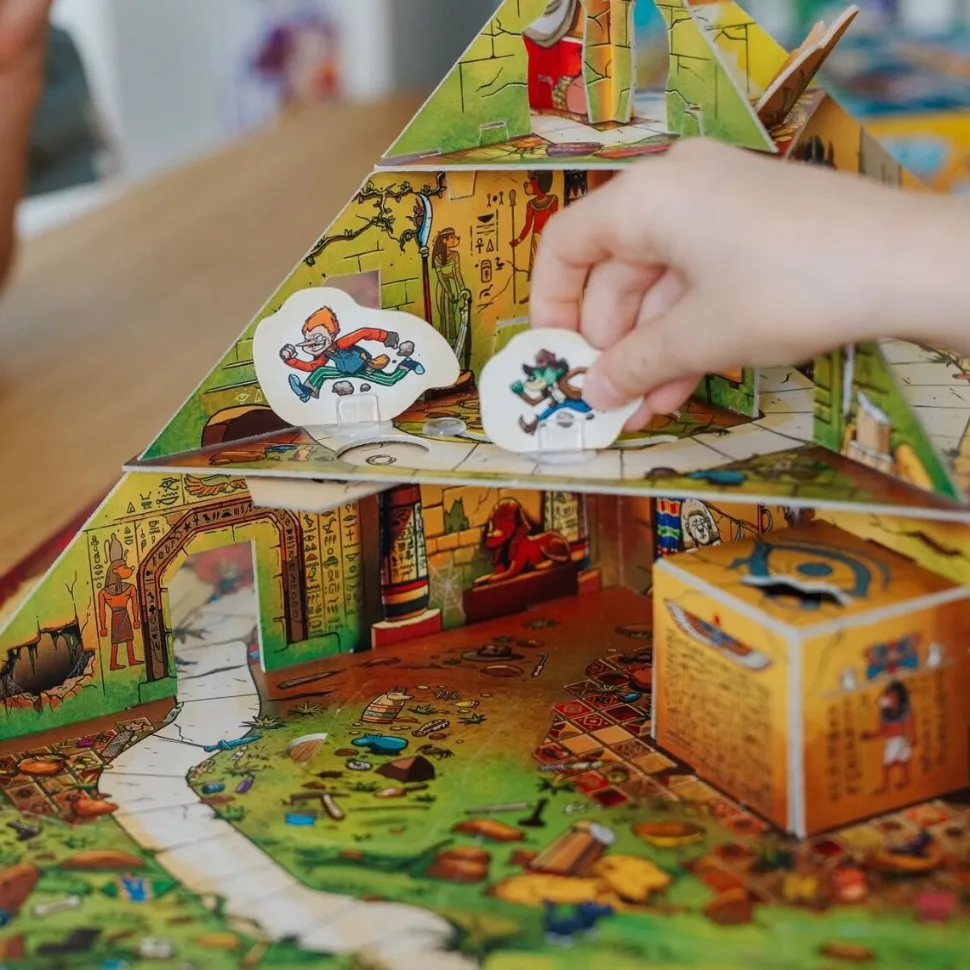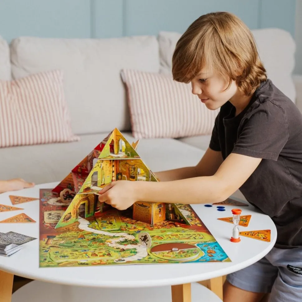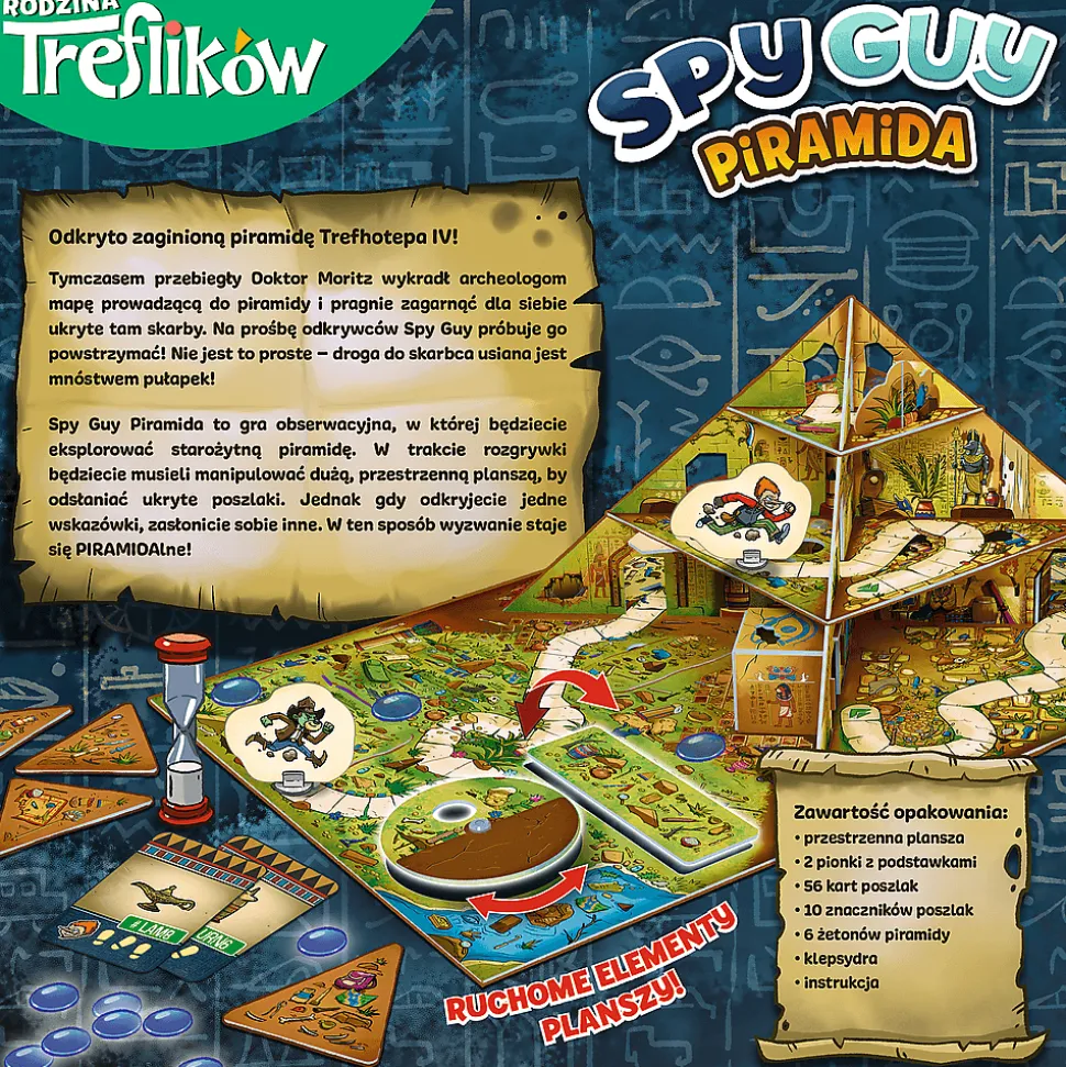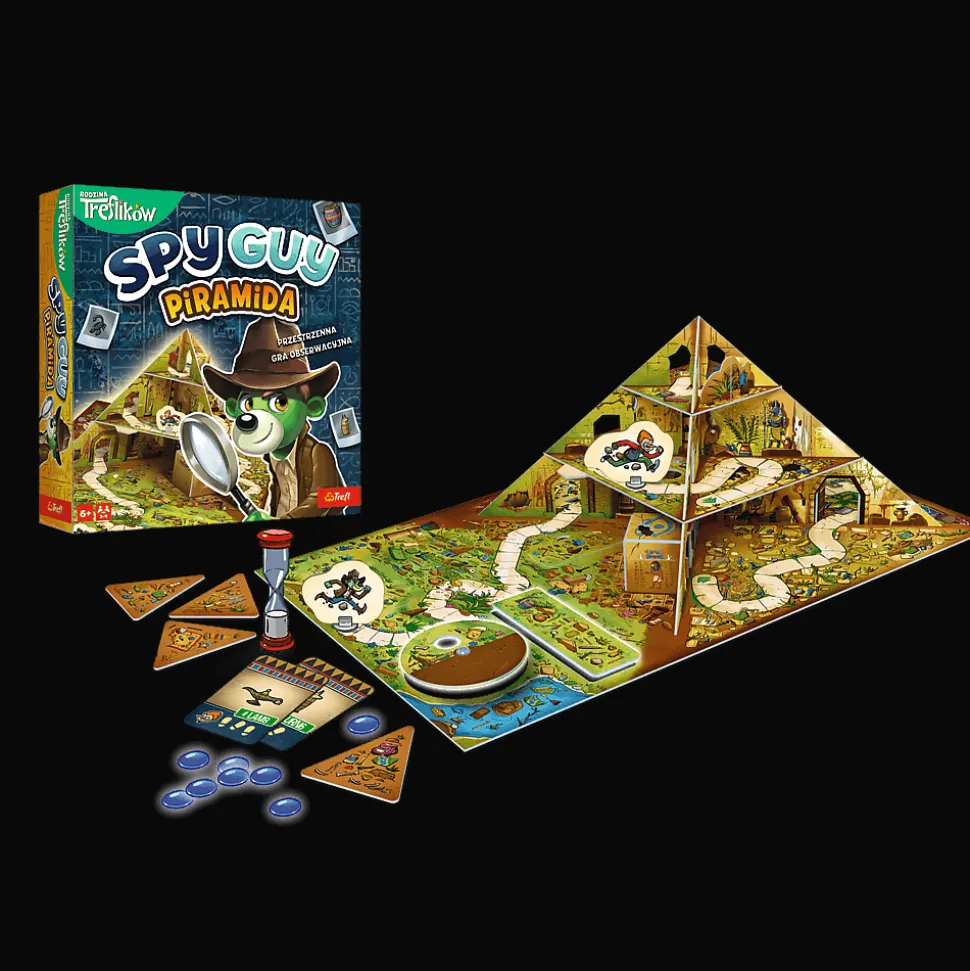 Spy Guy Piramida to odsłona kooperacyjnej gry obserwacyjnej z niesamowitą, przestrzenną planszą, wyposażoną w ruchome elementy. Spy Guy znów ściga przebiegłego Moritza, tym razem próbując udaremnić kradzież kosztowności ukrytych w piramidzie.