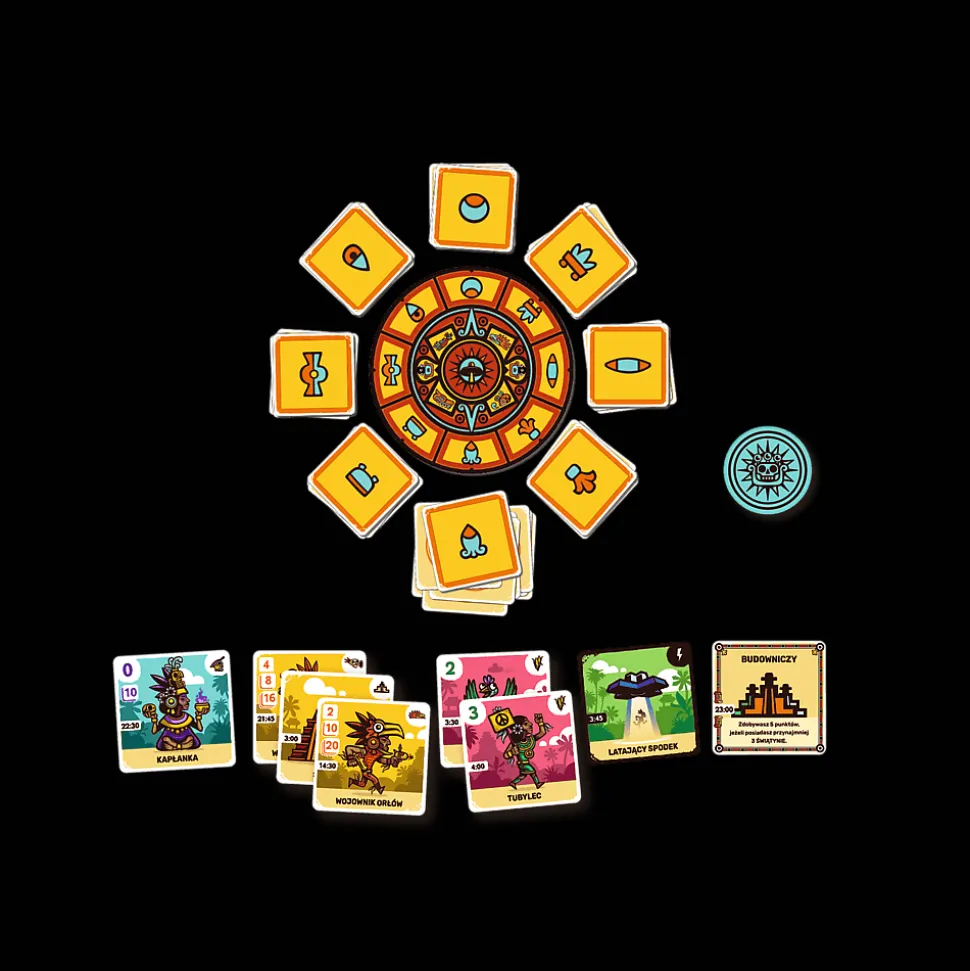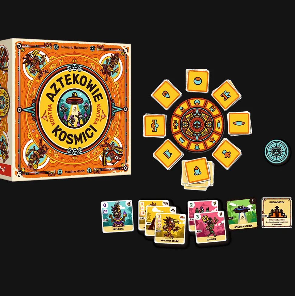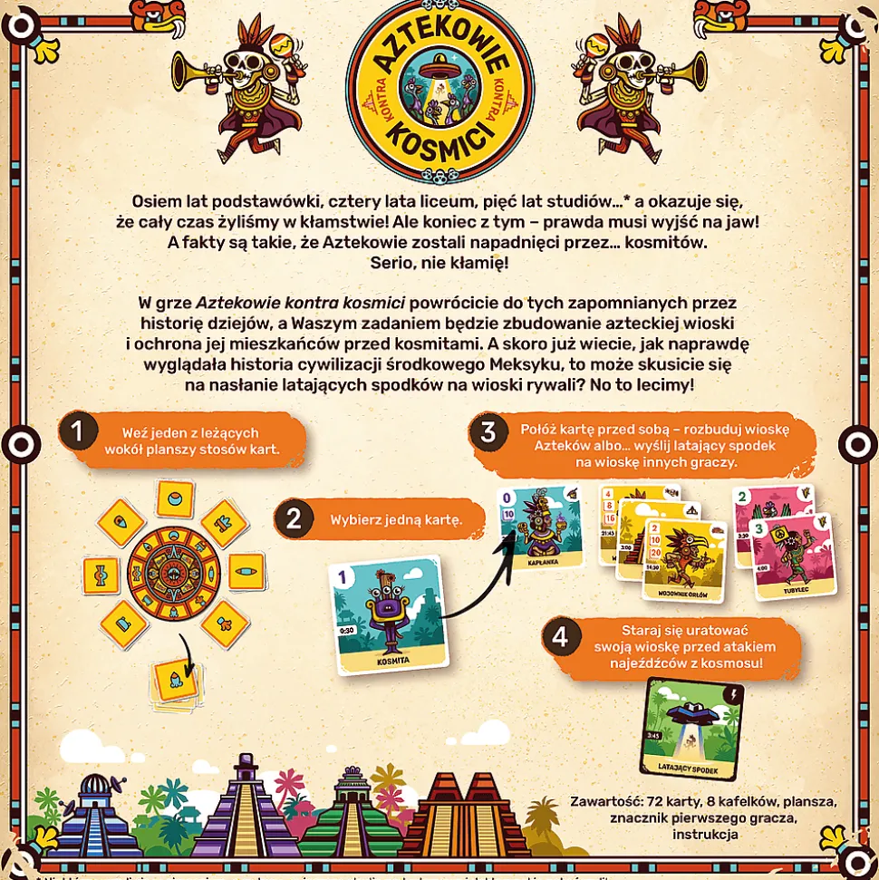 Aztekowie kontra kosmici to ciekawie ilustrowana gra towarzyska, w której przeniesiecie się do zapomnianych przez historię dziejów i zbudujecie aztecką wioskę. Następnie czeka Was nie lada przygoda — będziecie musieli ochronić swoich mieszkańców przed atakiem najeźdźców z kosmosu! Możecie też wykazać się przebiegłością i wysłać latające spodki na wioski innych graczy.