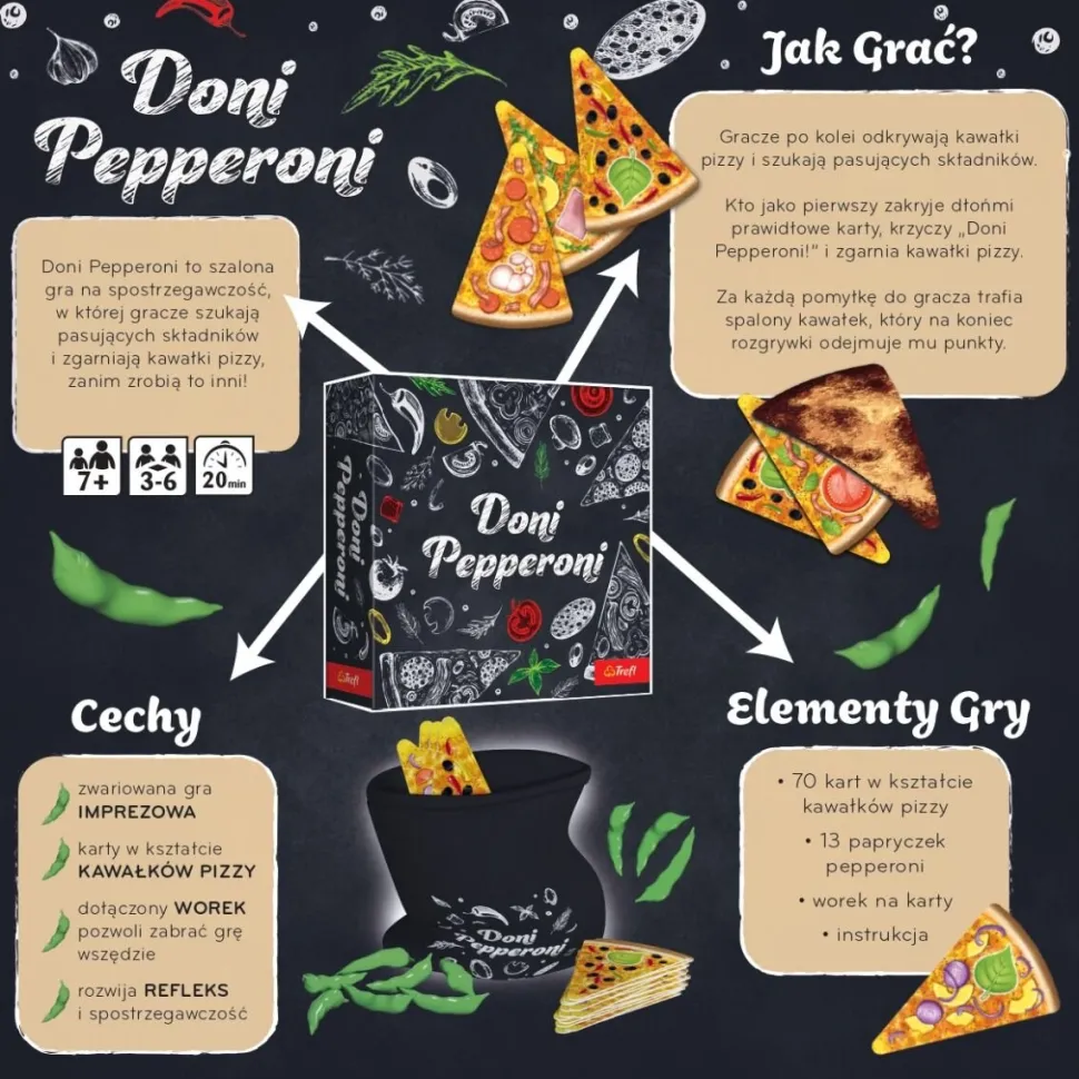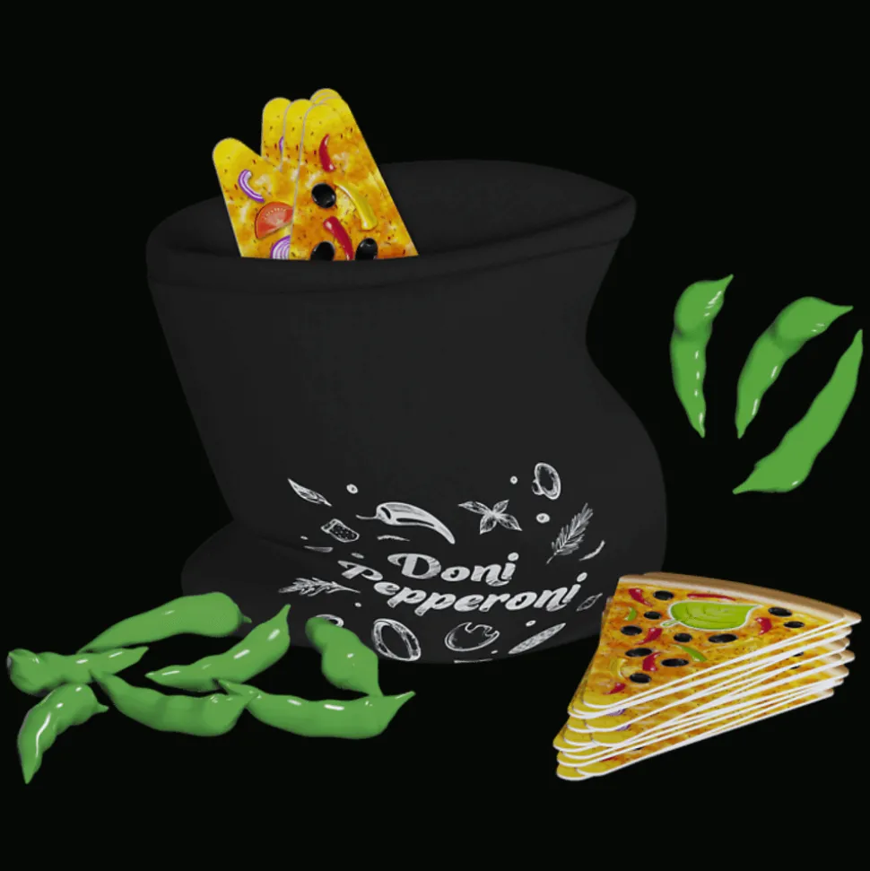 Doni Pepperoni to szalona gra na spostrzegawczość! Twoim zadaniem jest odnajdywanie pasujących składników i szybkie zdobywanie kawałków pizzy, zanim zrobią to inni gracze. Musisz uważać na to, co mówisz i robisz, bo chwila nieuwagi może spowodować, że zostaniesz ukarany spalonym placekiem. Celem gry jest zdobycie jak największej liczby smakowitych kawałków pizzy. Za każdą pomyłkę otrzymasz spalony placek, który zmniejszy twoje punkty na końcu gry.