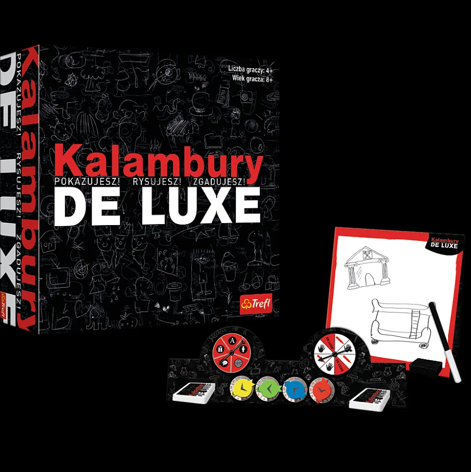 Kalambury de Luxe to znana i lubiana gra towarzyska w nowej, wyjątkowej odsłonie. Ponad osiemset haseł w pięciu kategoriach, do pokazywania lub rysowania! Spróbuj opanować wybuchy śmiechu, kiedy będziesz odgadywać kalambury razem ze swoją drużyną!