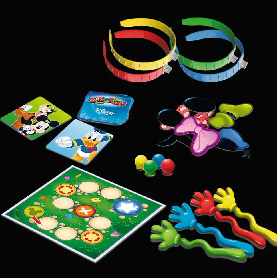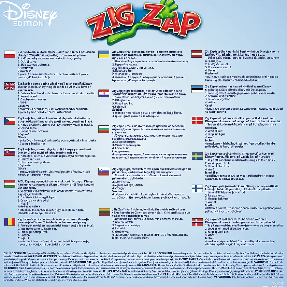 Zig Zap to dynamiczna gra, w której łapiecie packami określone karty z postaciami Disneya. Wszystko zależy od tego, co znajduje się na opasce na Waszej głowie.