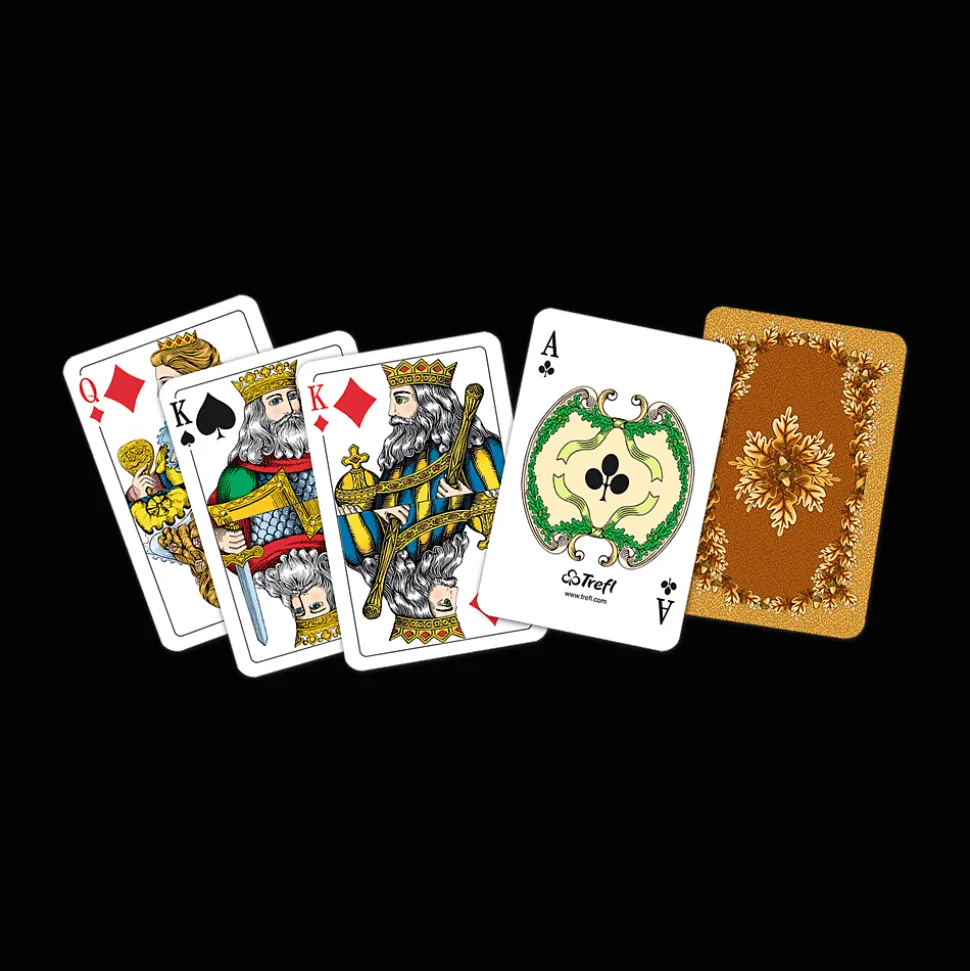 Karty standardowe 24 listki Classic – wyjątkowe karty do gier, które od lat są popularne w Polsce, w sam raz dla miłośników tradycji i klasyki. Karty posiadają charakterystyczne bursztynowe rewersy z liśćmi dębu oraz standardowe figury i kolory.