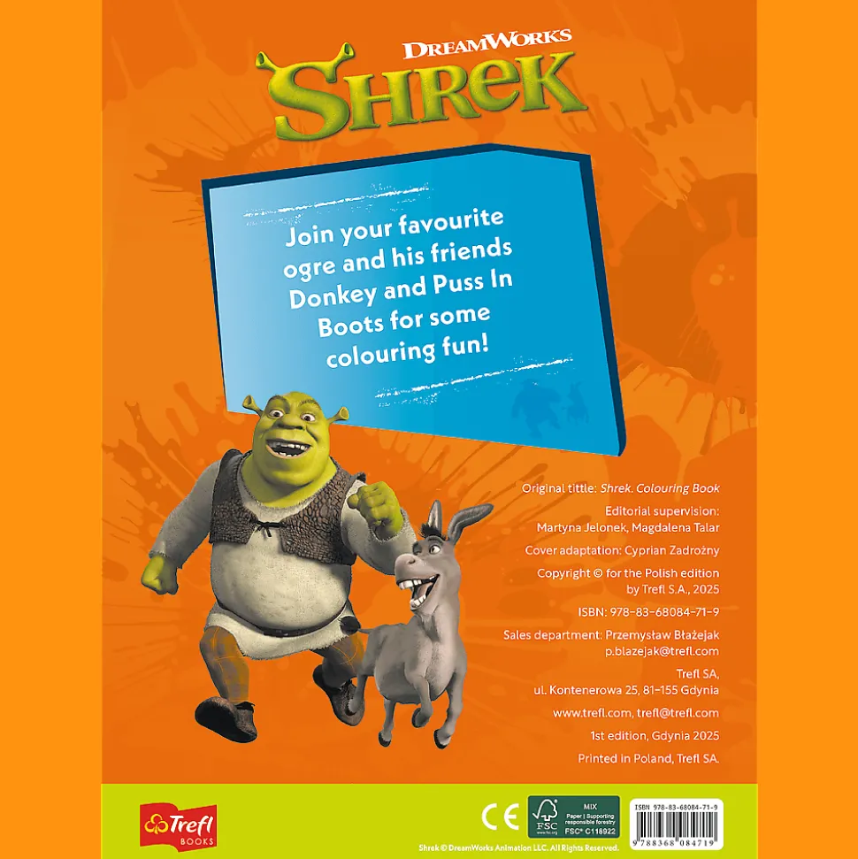 Wejdź do zaczarowanego świata Shreka i jego nietypowej paczki! Ta pełna humoru kolorowanka przenosi dzieci do baśniowej Krainy Zasiedmiogórogrodu, gdzie czekają postacie takie jak Shrek, Fiona, Osioł i Kot w Butach. Kolorując ulubionych bohaterów, maluchy rozwijają swoją kreatywność, precyzję i zdolności manualne. To idealna propozycja dla fanów zabawnych przygód i bajkowego klimatu!