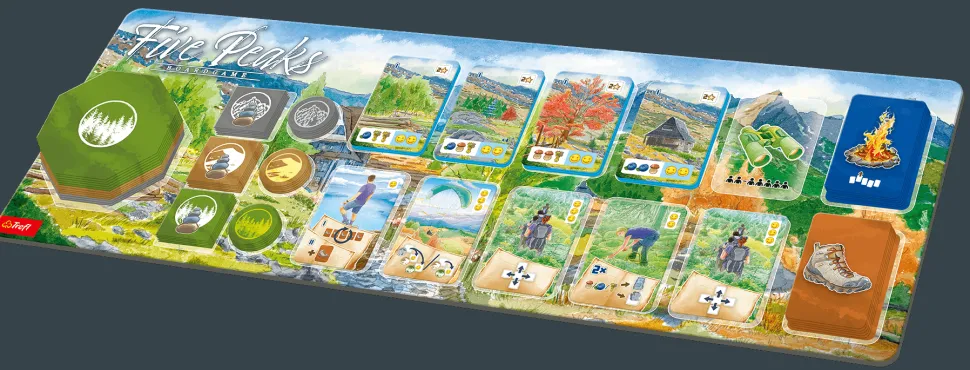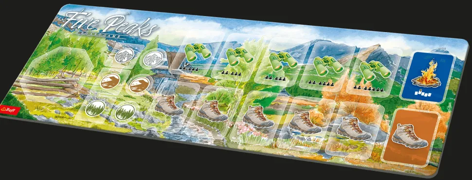 Gumowa mata przeznaczona do gry Pięć Szczytów, która ułatwi przygotowanie elementów do rozgrywki. Specjalne grafiki podpowiedzą, gdzie umieścić potrzebne karty, kafelki i żetony, co przyśpieszy i uporządkuje przygotowanie się do kolejnych partii. Mata jest antypoślizgowa, więc wszystkie elementy pozostaną na swoim miejscu, jednocześnie ułatwiając ich pobieranie ze stołu. Po zakończeniu rozgrywki matę możesz spokojnie złożyć i schować do pudełka wraz z grą.