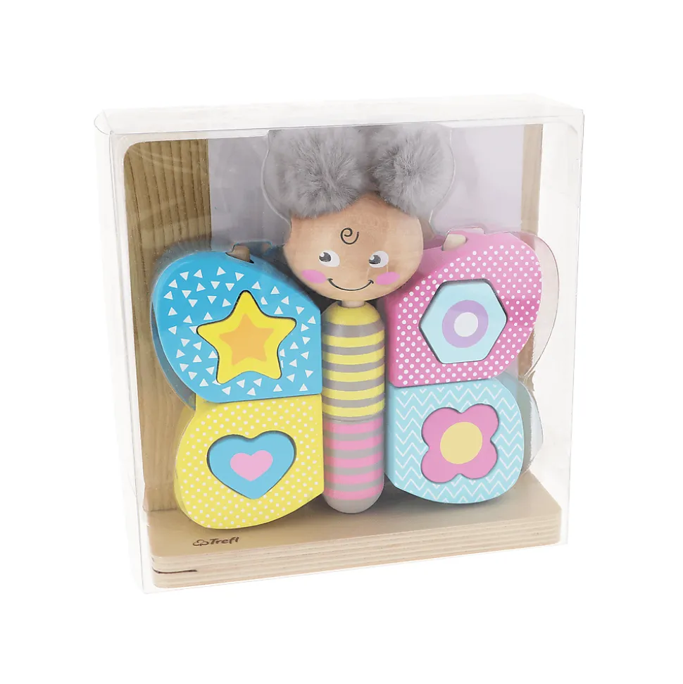Motylek Pupilek z puszystymi pomponami to doskonałe rozwiązanie dla dzieci już od 18 miesiąca życia. Zabawka została wykonana z wysokiej jakości naturalnego drewna oraz pluszu. Skrzydełka po rozłożeniu pełnią funkcję sortera. Motylek składa się z 11 ruchomych klocków, które wspomagają rozwój zręczności i motoryki dziecka, a pluszowe pompony rozwijają zmysł dotyku.