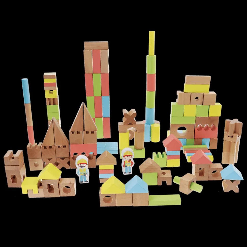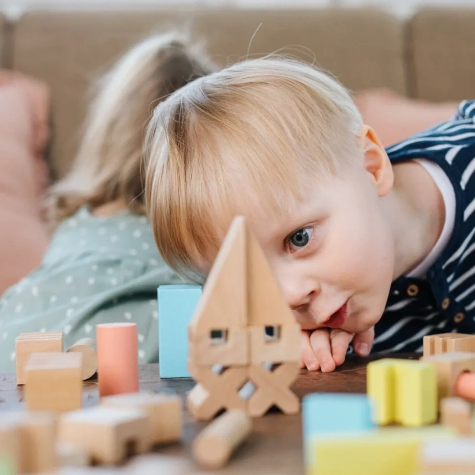 Edukacyjny zestaw 142 kolorowych klocków o różnorodnych, niestandardowych kształtach: grzebienie, łuki, klocki z otworami, walce. Aż 13 różnych kształtów w zestawie! Zestaw stworzony we współpracy z psychologiem, z myślą o potrzebach najmłodszych.