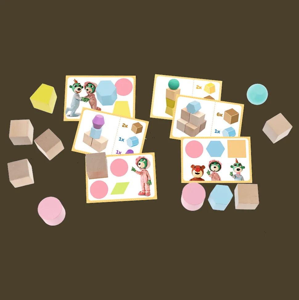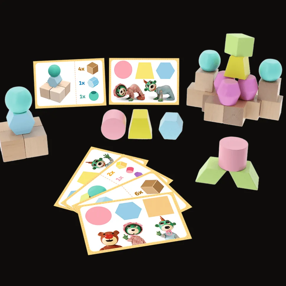 Dopasuj odpowiedni kształt klocka do obrazka znajdującego się na dużej karcie lub odwzoruj konstrukcję z karty w przestrzeni!