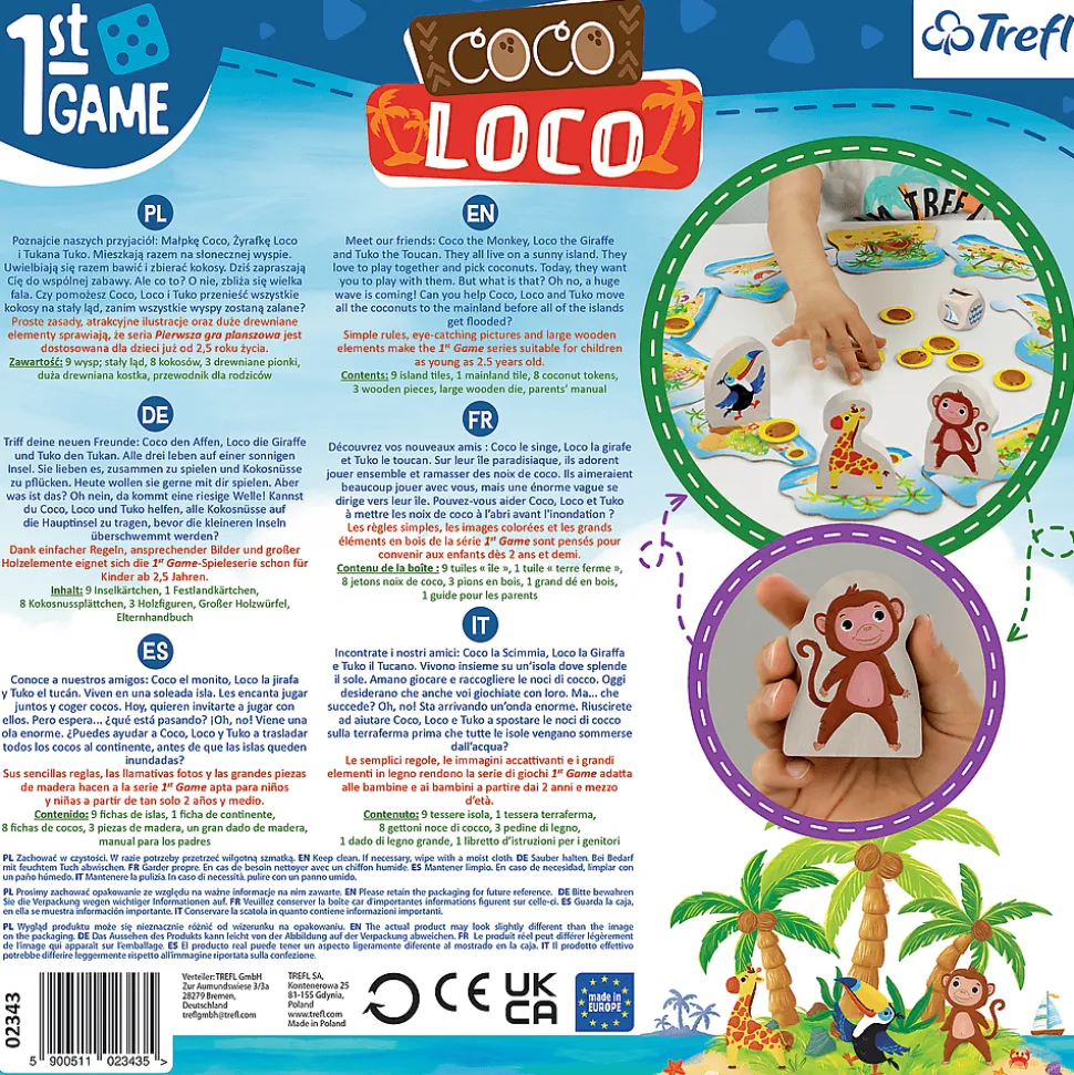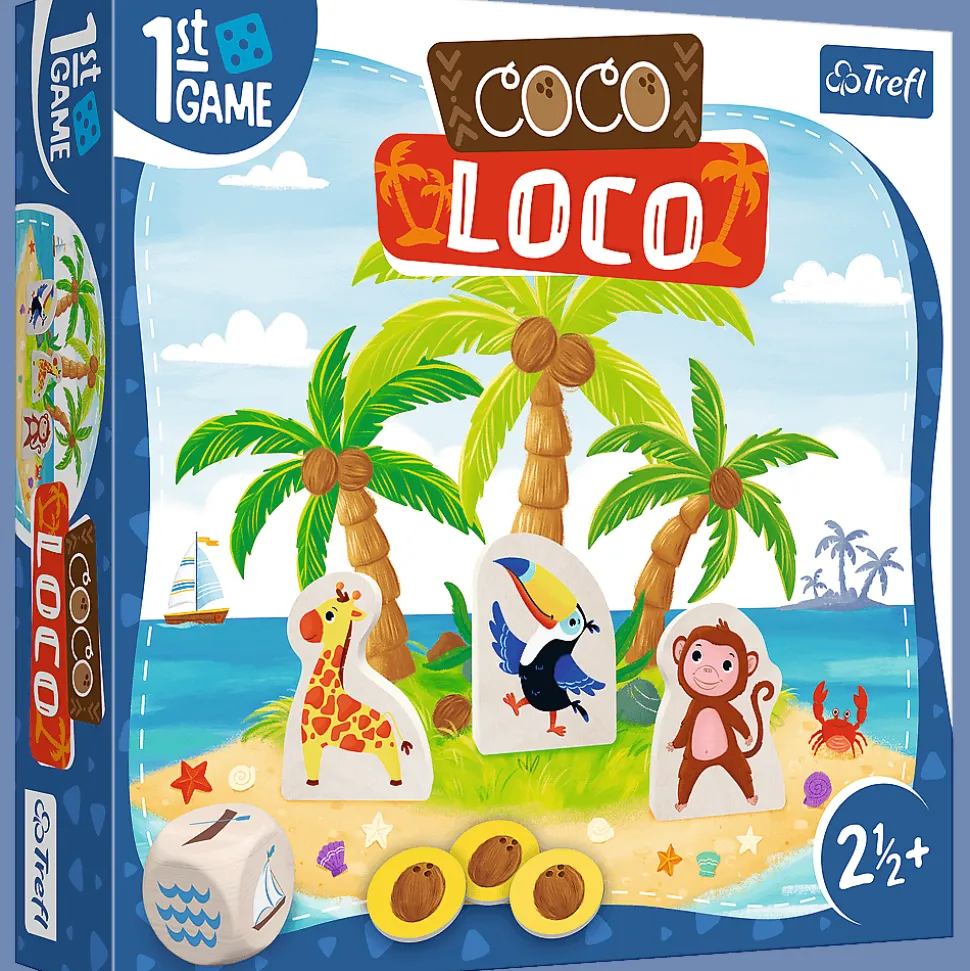 Pierwsza gra planszowa Coco Loco jest dostosowana dla dzieci już od 2,5 roku życia. Zawiera proste zasady, atrakcyjne ilustracje i duże drewniane elementy.