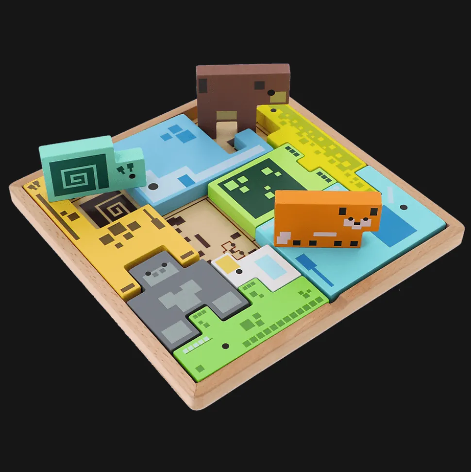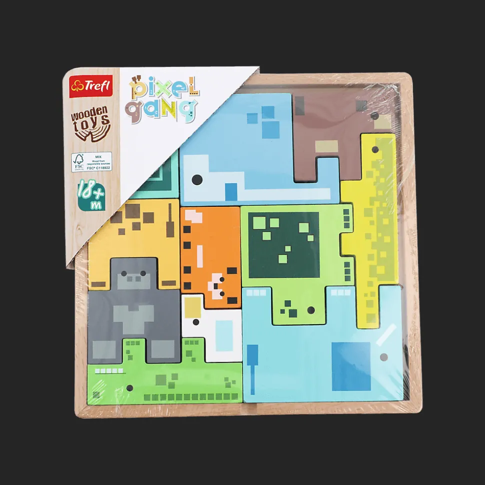 Pixel Gang to drewniana łamigłówka, która polega na ułożeniu klocków w kształcie pikselowych zwierzątek, tak aby wypełniły całą ramkę. Kontury znajdujące się na podstawce ułatwiają zadanie. Z łamigłówką poradzą sobie dzieci już od 18. miesiąca życia. Drewniane zwierzęta mogą również posłużyć za figurki do zabawy.