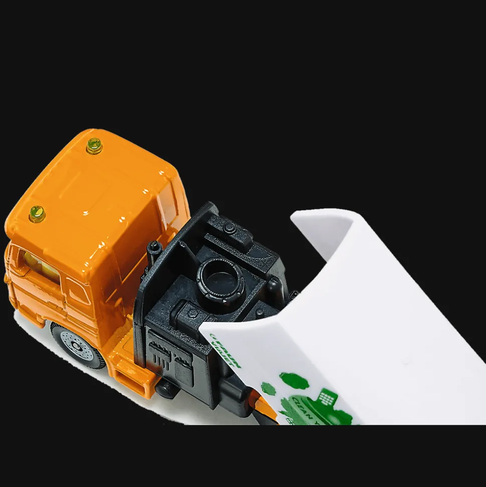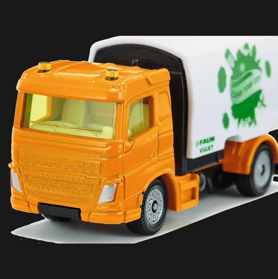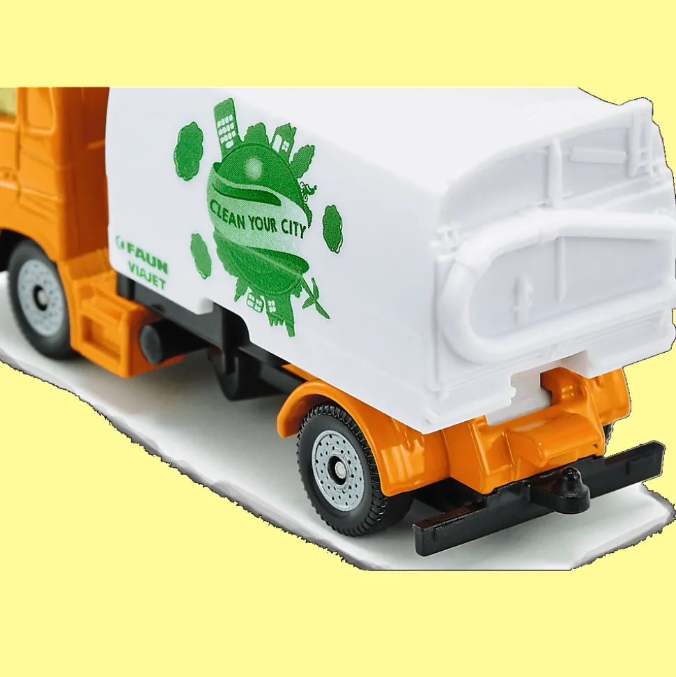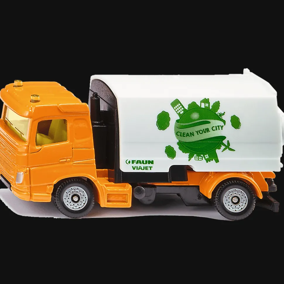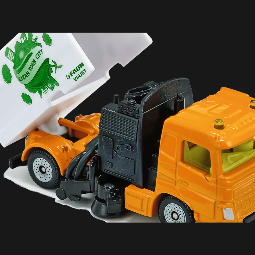 Strefa dla pieszych, czy dzielnica mieszkaniowa – zamiatarka firmy Faun Umwelttechnik dba, aby całe miasto było czyste! Dzięki lekkobieżnym kołom i dwuosiowemu podwoziu z tworzywa sztucznego jest wyjątkowo zwrotna i radzi sobie na wszystkich ulicach i placach. Dzięki metalowej kabinie, a także nadwoziu zamiatarki i plastikowej przyssawce, jest idealnie wyposażona, aby sprostać każdemu zadaniu sprzątania, bez względu na stopień zabrudzenia. Pojemnik na zanieczyszczenia można podnieść w celu opróżnienia. Dzięki jaskrawej, pomarańczowej kabinie zamiatarka jest widoczna z daleka. Na pojemniku widniej zielony napis „Clean your City”.