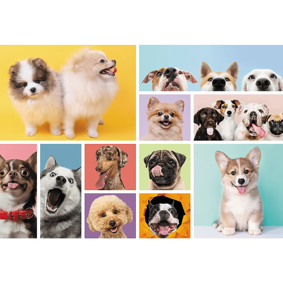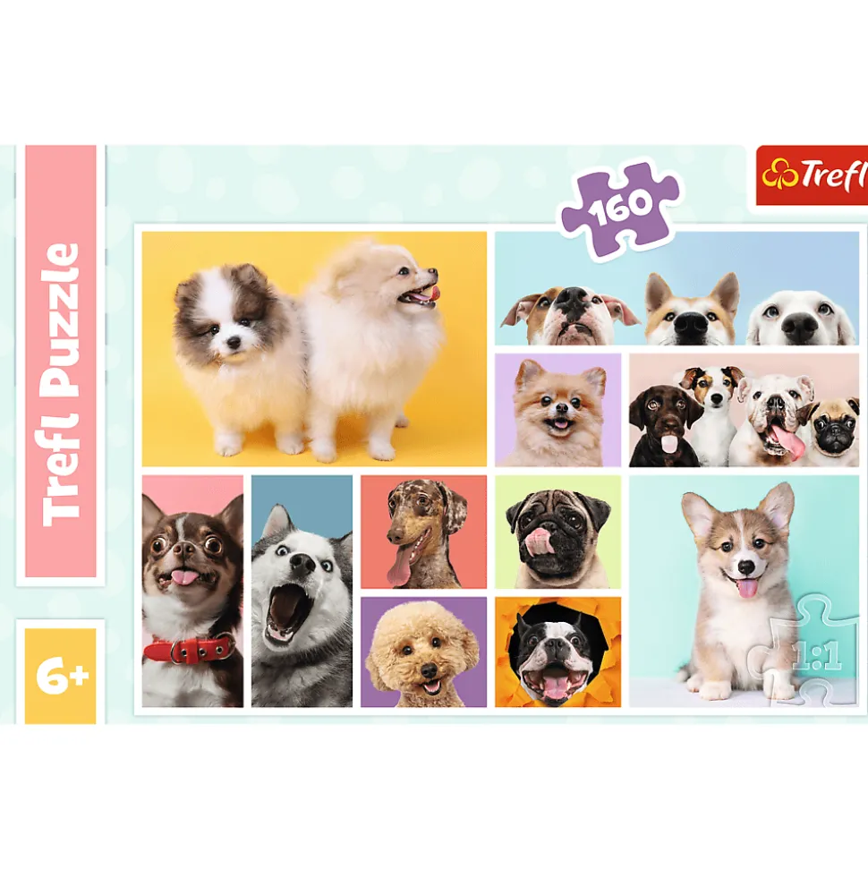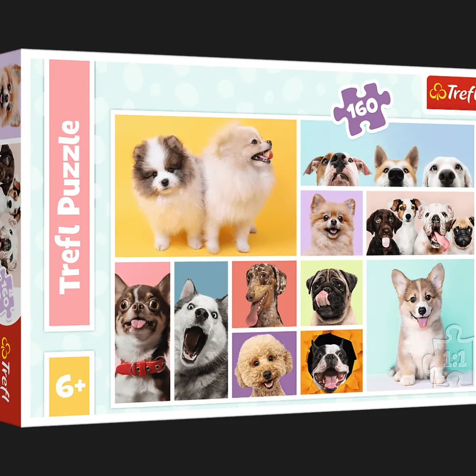 Wyjątkowe puzzle dla dzieci przedstawiają psią przyjaźń, czyli urocze pieski pozujące razem. Zestaw puzzli składa się ze 160 elementów i pozwala ułożyć kolorowy obrazek o wymiarach 410×278 mm.