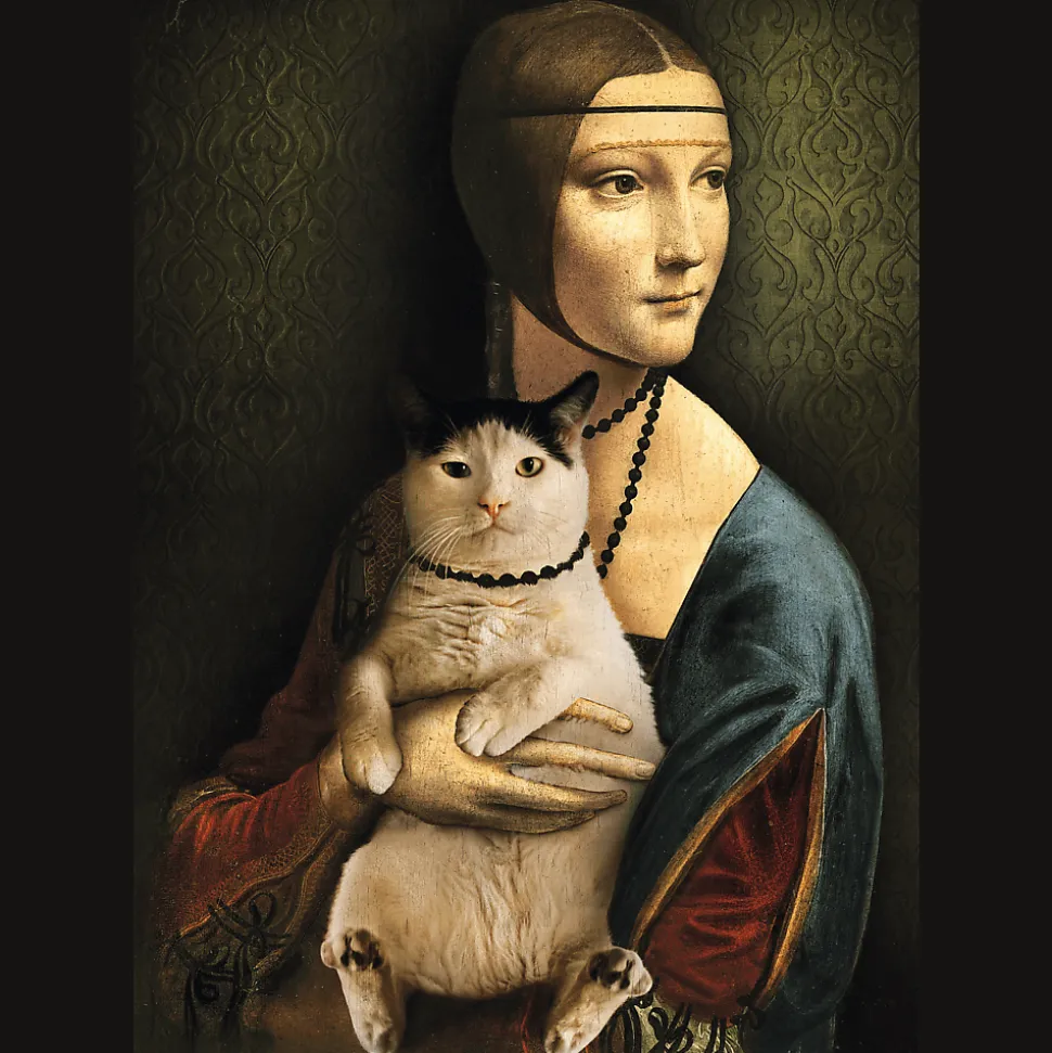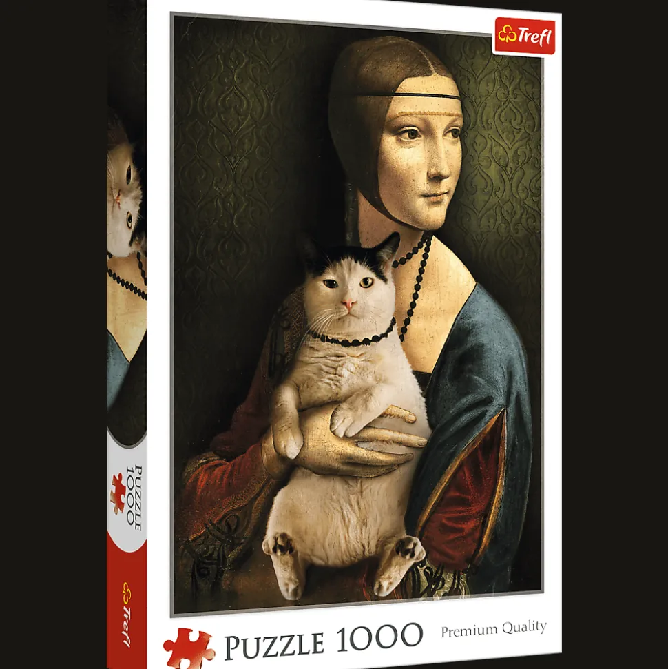 Puzzle składające się z 1000 elementów przedstawiające Damę z kotem. Po ułożeniu powstanie obrazek o wymiarach 683×480 mm.
