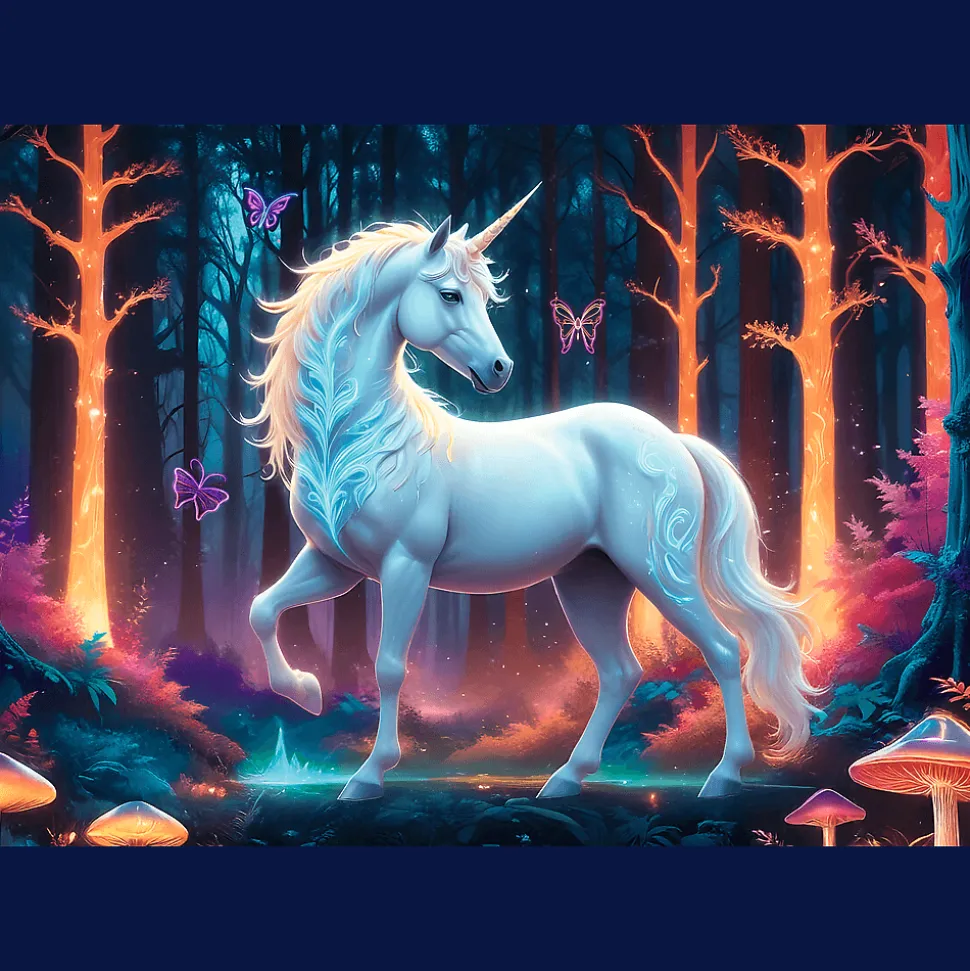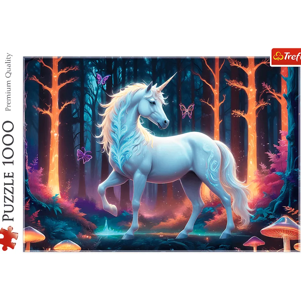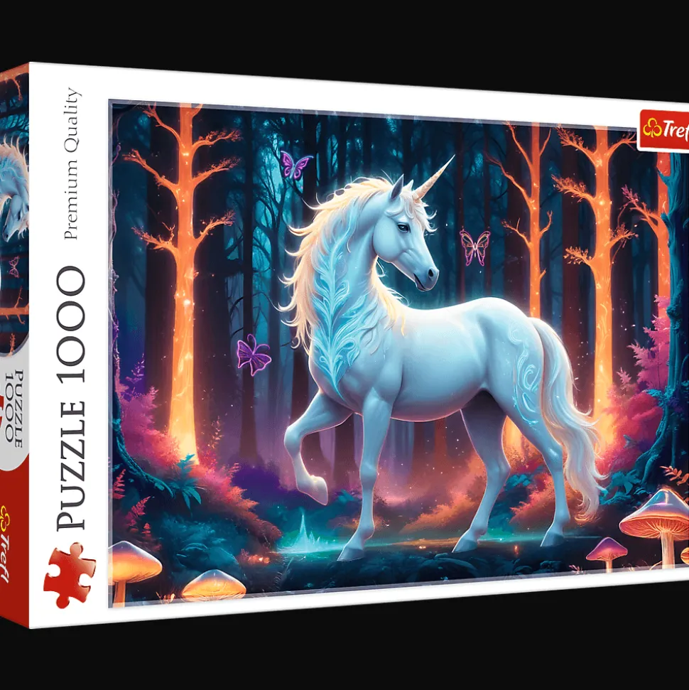 Puzzle Majestatyczny jednorożec, składające się z 1000 elementów, przedstawiają różnobarwnego jednorożca w bajkowej scenerii. Po ich ułożeniu powstanie obrazek w rozmiarach 683×480 mm.