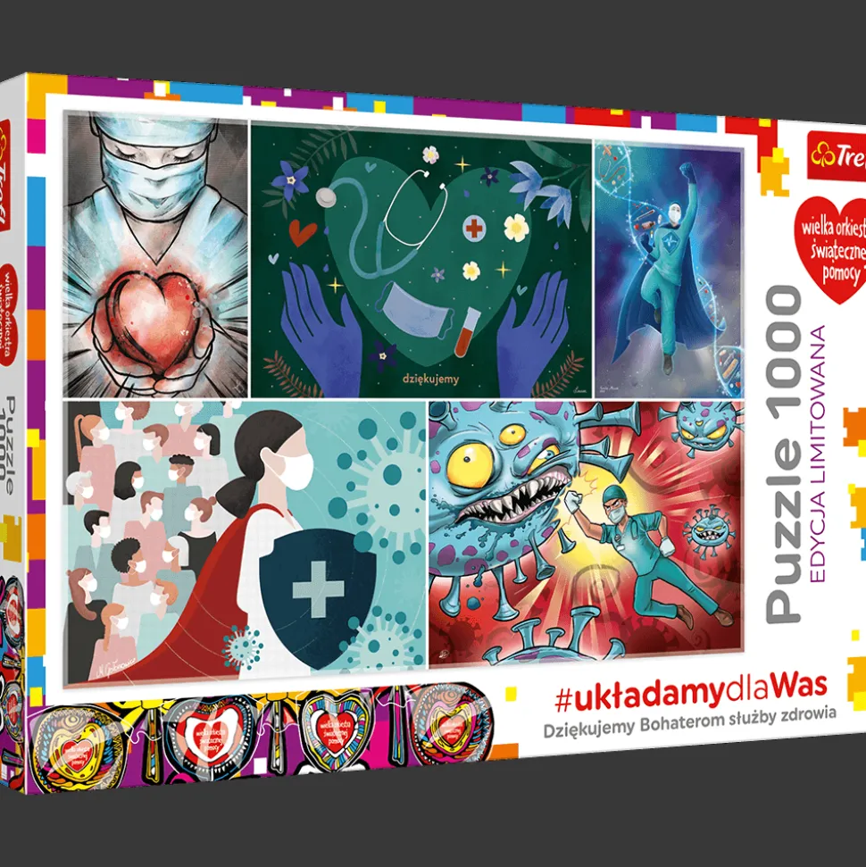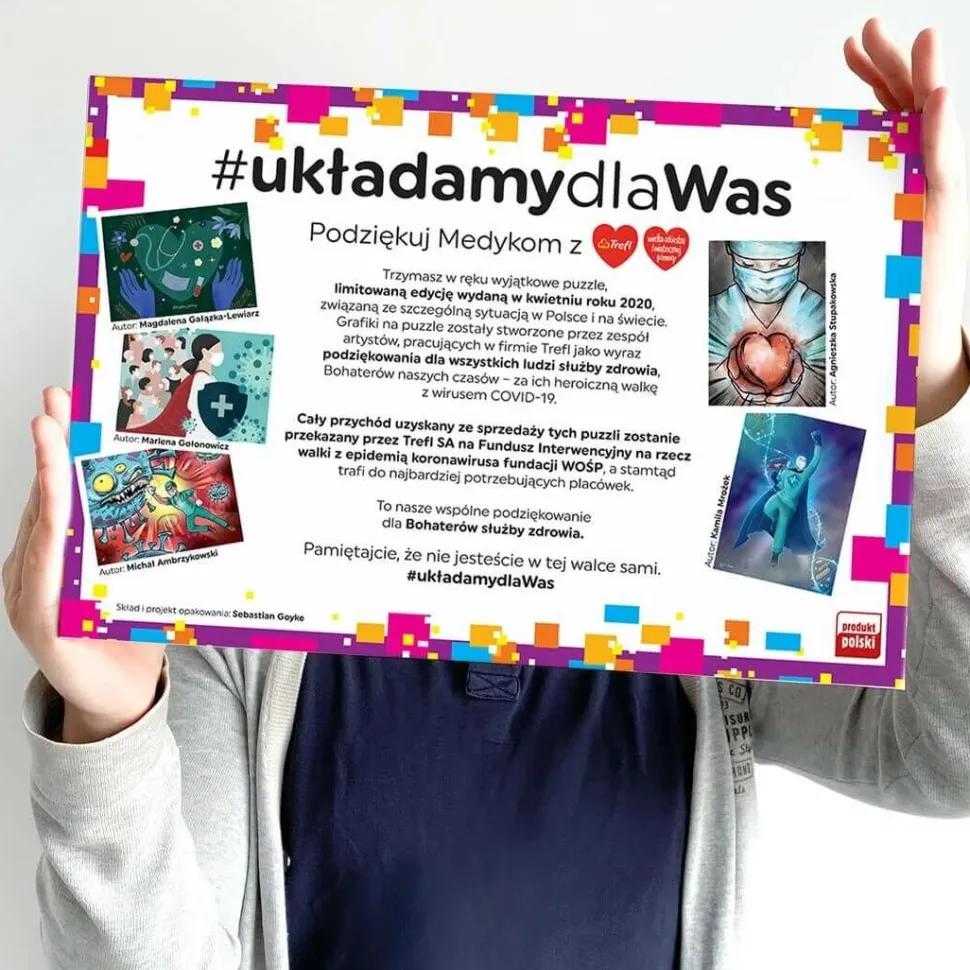 Puzzle #układamydlaWas to specjalny produkt, który Trefl wspólnie z Wielką Orkiestrą Świątecznej Pomocy dedykuje pracownikom służby zdrowia – Bohaterom walczącym z wirusem COVID-19. Cały przychód ze sprzedaży tego wzoru puzzli zostanie przekazany przez Trefl SA na Fundusz Interwencyjny Fundacji WOŚP na rzecz walki z koronawirusem.