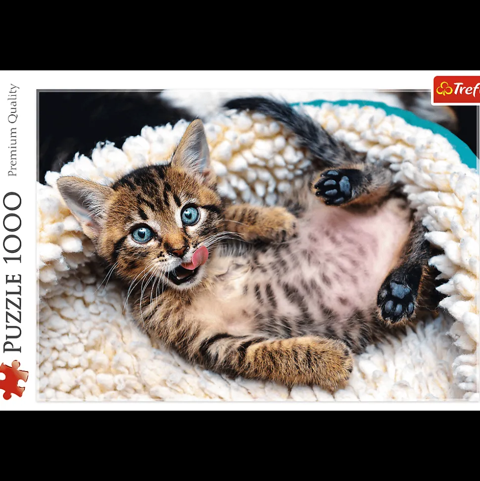 Puzzle 1000 elementów przedstawiające wesołego kotka. Po ułożeniu powstanie obrazek o wymiarach 68×48 cm. Wysoką jakość, nasycenie kolorów i bezpieczeństwo układania zapewnia kalandrowany papier odbijający światło, pokryty ekologicznymi farbami spożywczymi.