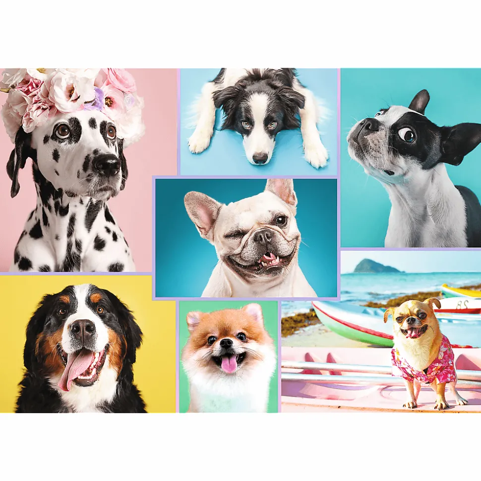 Puzzle składające się z 1500 elementów przedstawiające kolaż ze słodkimi pieskami. Po ułożeniu powstanie obrazek o wymiarach 85x58cm.