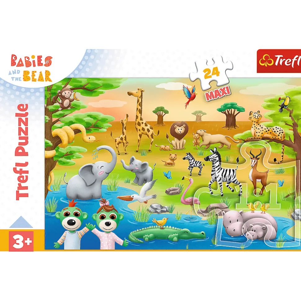 Safari – Bobaski to puzzle dla maluchów, składające się z 24 bardzo dużych elementów. Zostały zaprojektowane z myślą o małych miłośnikach zwierząt i bajki Bobaski i Miś. Po ułożeniu układanki powstanie duży obrazek o wymiarach 600×400 mm.
