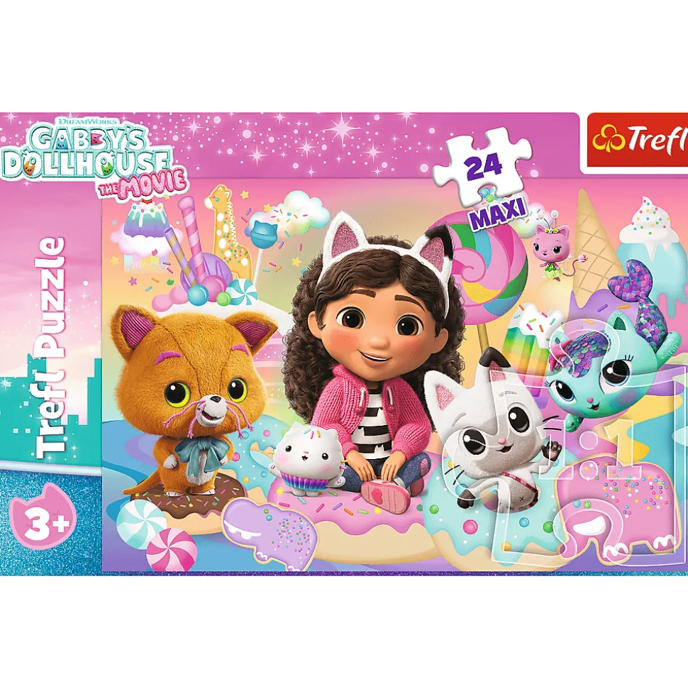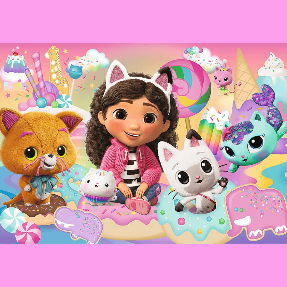 Koci świat Gabby to puzzle dla maluchów, składające się z 24 bardzo dużych elementów. Zostały zaprojektowane z myślą o małych fanach bajki Gabby’s Dollhouse. Po ułożeniu układanki powstanie duży obrazek o wymiarach 600×400 mm.