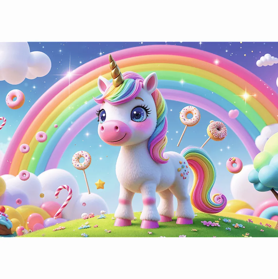 Cukierkowy świat to puzzle składające się z 60 elementów, zaprojektowane z myślą o małych fanach zwierząt. Puzzle przedstawiają tęczowego jednorożca w krainie słodkości. Po ułożeniu układanki powstanie obrazek o wymiarach 330×220 mm.