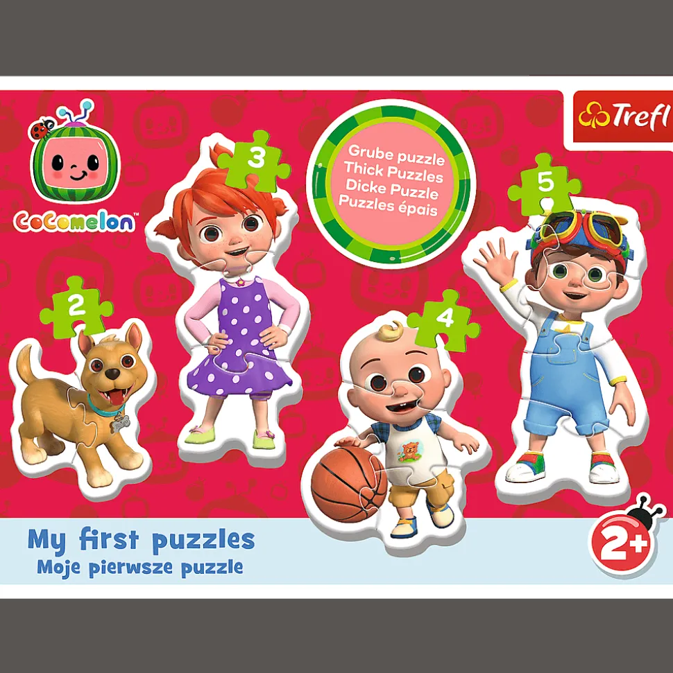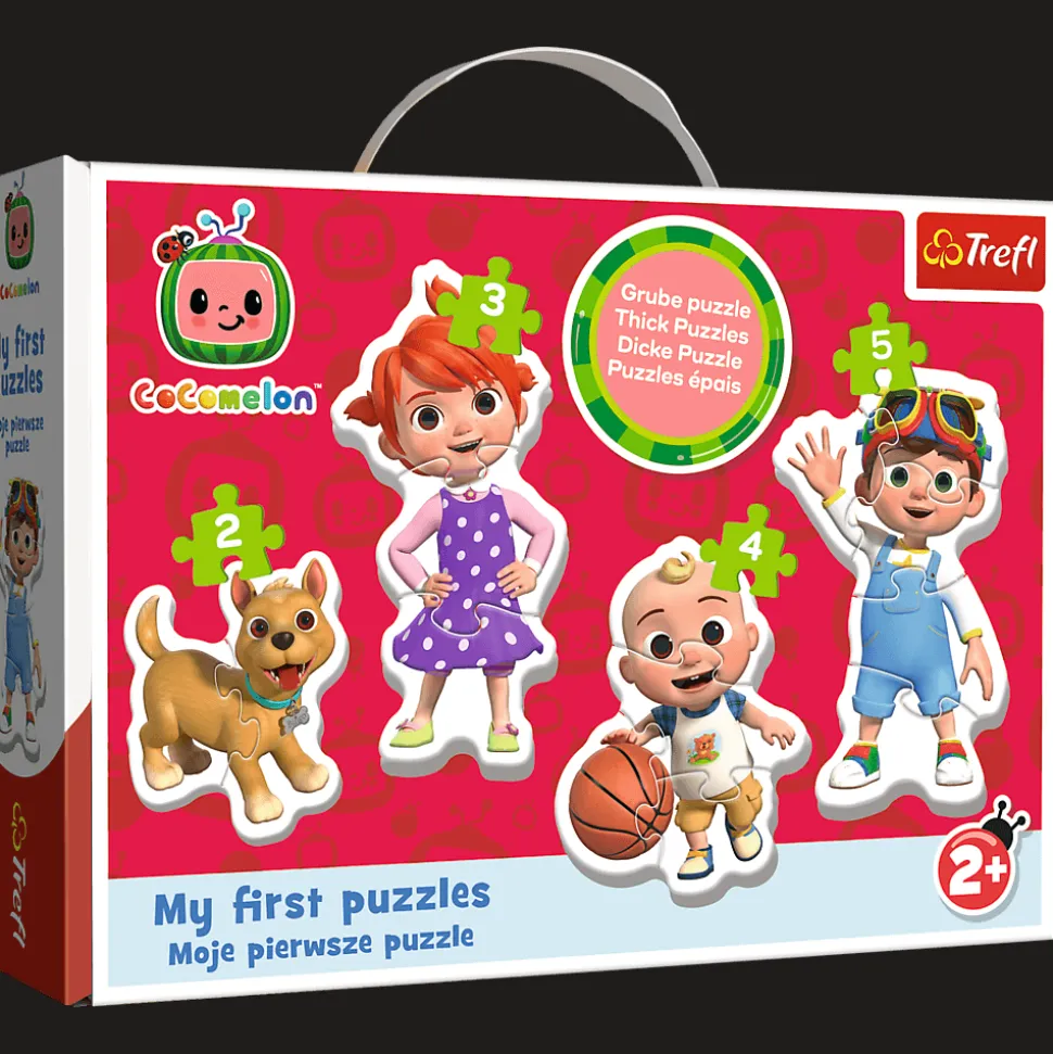 Cocomelon z seri Moje pierwsze puzzle to puzzle składające się z 14 grubych elementów (oddzielne układanki po 2, 3, 4 i 5 elementów), zaprojektowane z myślą o wszystkich najmłodszych miłośnikach przygód Cocomelon, a więc dzieci od 2 roku życia.