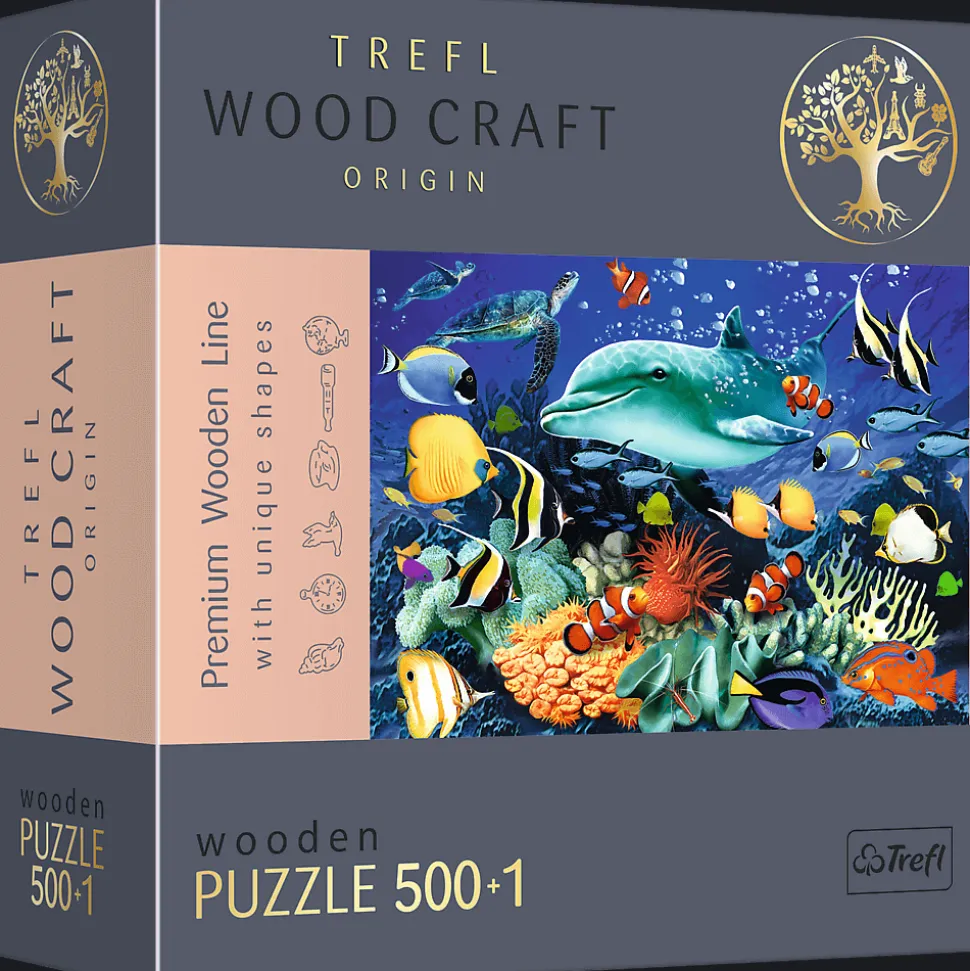 Seria puzzli 500+1 elementów jest idealna dla wszystkich miłośników układanek. Pozwoli stworzyć obrazek o wymiarach 37,5 x 25,4 cm przedstawiający podwodne życie zwierząt morskich, dlatego sprawdzi się idealnie jako prezent dla wielbicieli mórz i oceanów. Układanka została wykonana z drewna, a opakowanie przyjazne środowisku w całości z tektury. Puzzle zawierają nieregularne elementy oraz 50 figurek o tematyce marynistycznej.