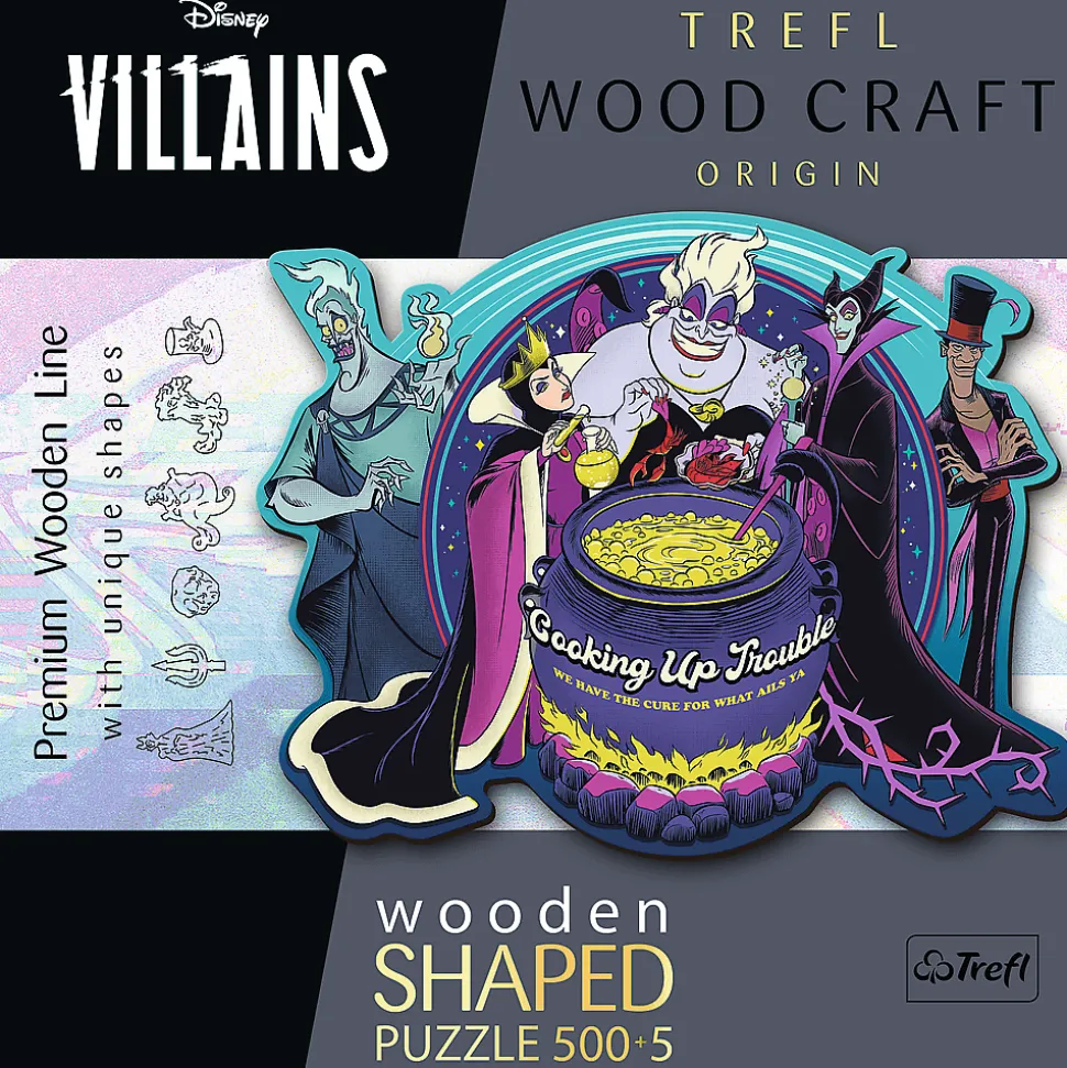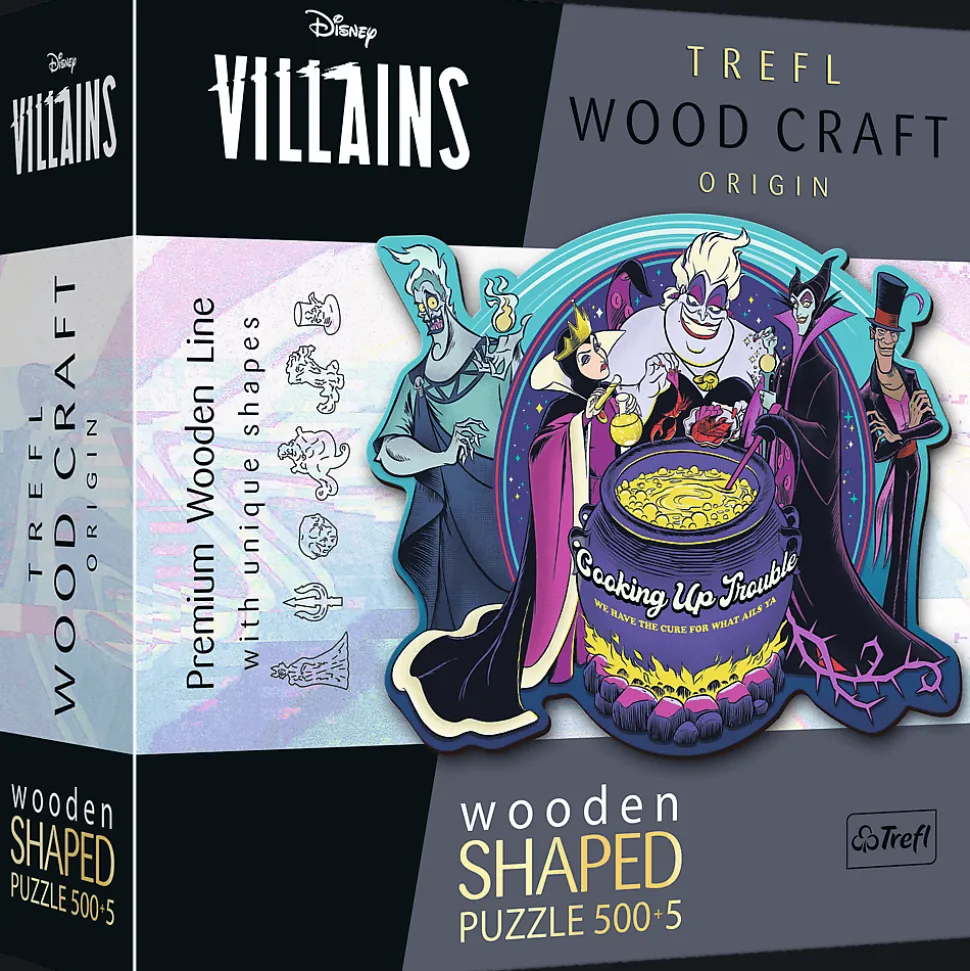 Seria drewnianych układanek, które składają się z 500+5 elementów jest idealna dla wszystkich miłośników puzzli! Po ułożeniu układanki Złoczyńcy: Przepis na kłopoty powstanie obrazek o wymiarach 37,5 x 41 cm, dedykowany wszystkim miłośnikom Disneya.