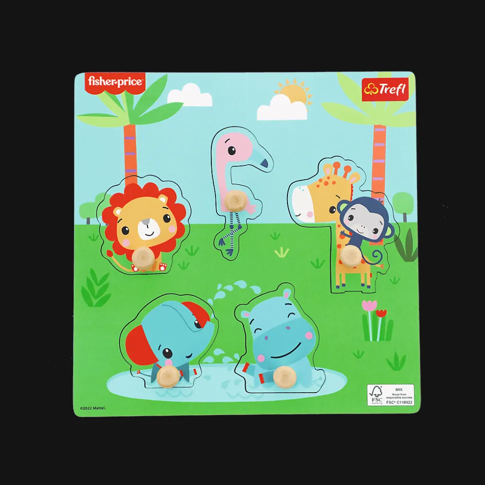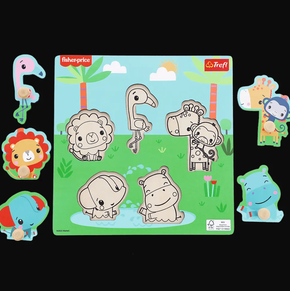 Puzzle Mini Fisher Price Fun – drewniane puzzle z kolorową grafiką na licencji Fisher price. Zadaniem dziecka jest dopasowanie puzzli w odpowiednie miejsce na podstawce – to ułatwi grafika znajdująca się na wyżłobieniach.