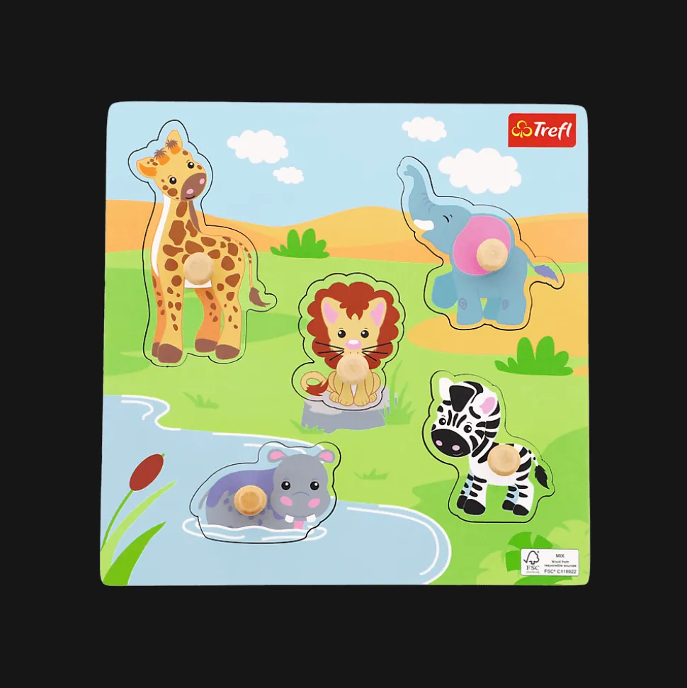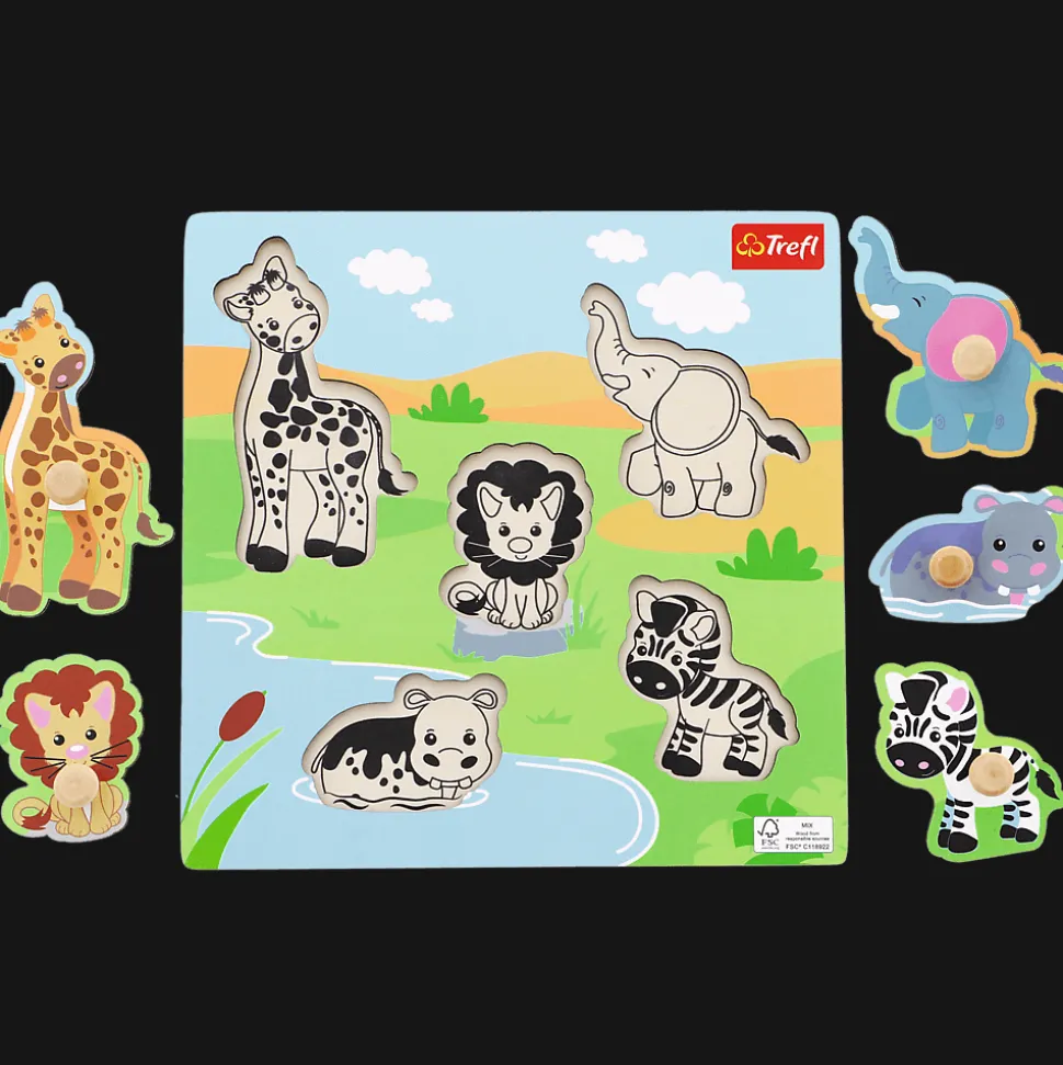 Puzzle mini Safari – drewniane puzzle z kolorową grafiką. Zadaniem dziecka jest dopasowanie puzzli w odpowiednie miejsce na podstawce – ułatwi to grafika znajdująca się na wyżłobieniach. Zabawka wspomaga ćwiczenie motoryki małej dziecka oraz dopasowywania kształtów. Drewniane puzzle są solidne i łatwe do chwytania. Zaprojektowane specjalnie z myślą o rozwoju Twojego dziecka.