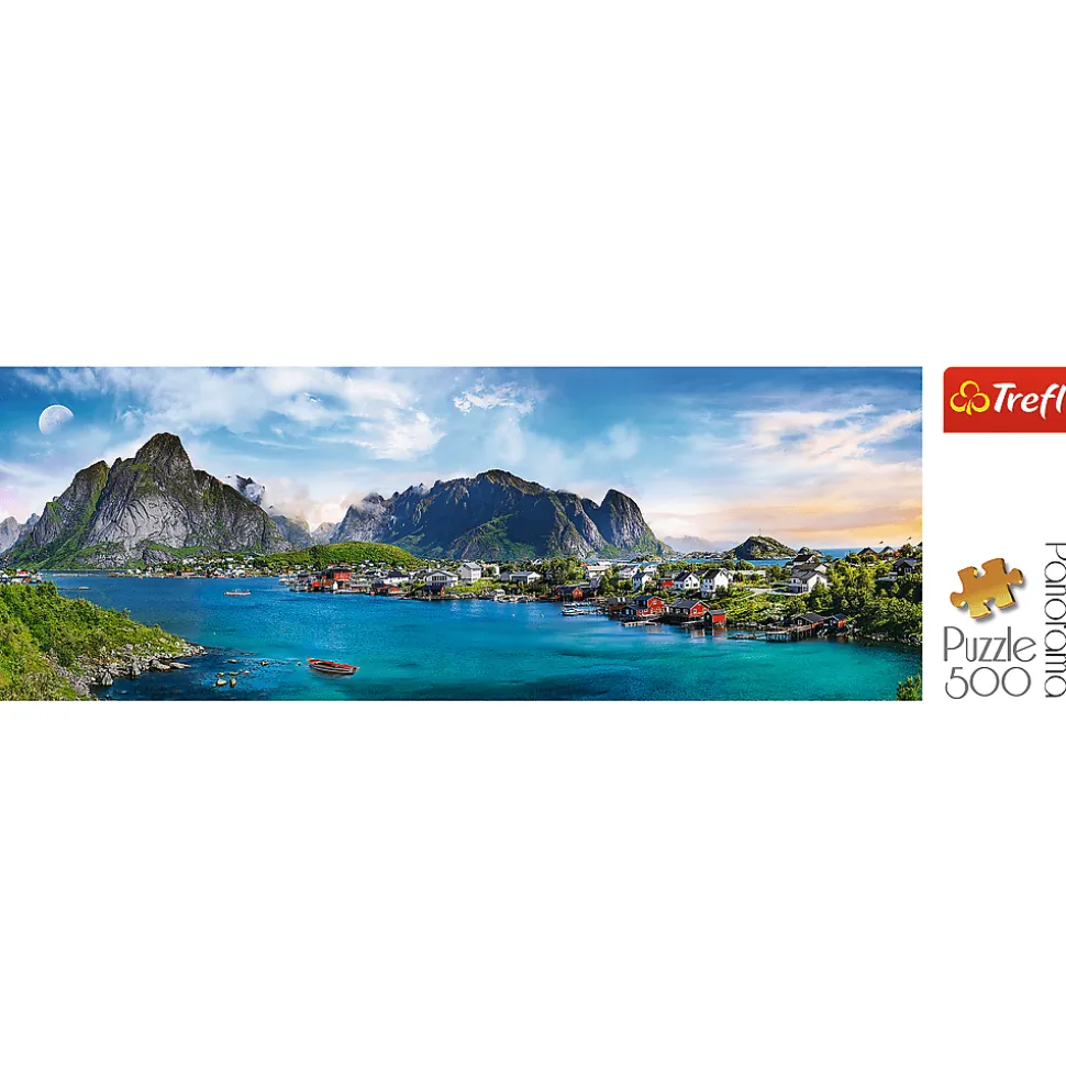 Puzzle panoramiczne składające się z 500 elementów przedstawiające Archipelag Lofoty w Norwegii. Po ułożeniu powstanie obrazek o wymiarach 660 x 237mm. Produkt został wykonany z wysokiej jakości materiałów, z zastosowaniem specjalnego kalandrowanego papieru odbijającego światło, co ułatwia układanie.