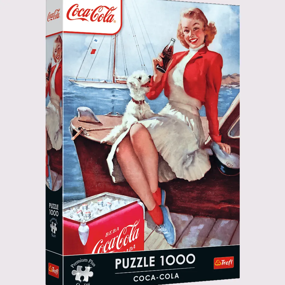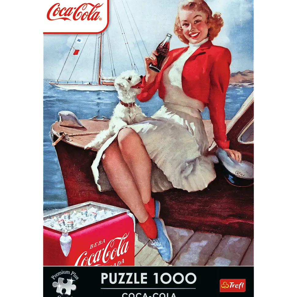 Puzzle Coca-Cola: Czas na przerwę przedstawiają uśmiechniętą dziewczynę z butelką słynnego napoju na tle jeziora. Po ich ułożeniu powstanie obraz o wymiarach 683×480 mm.
