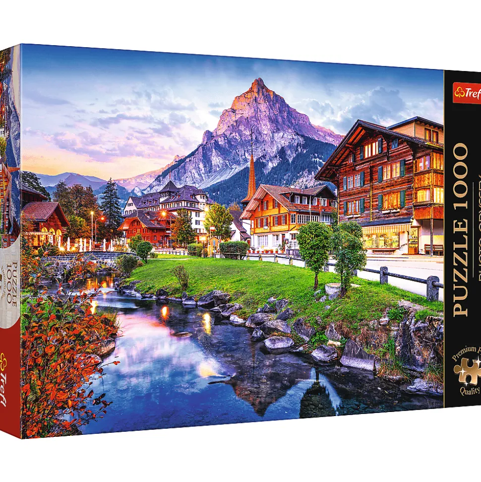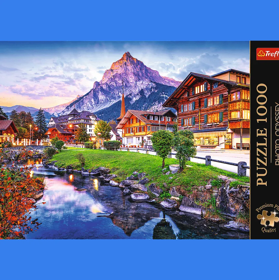 Puzzle Alepejskie miasteczko, Szwajcaria przedstawiają szwajcarskie miasteczko leżące u podnóza Alp. Po ich ułożeniu powstanie obraz o wymiarach 683×480 mm.