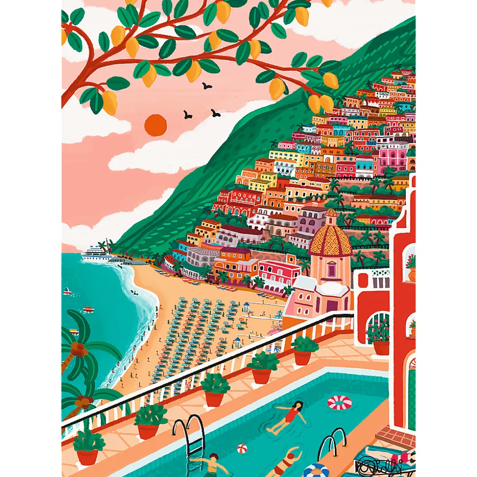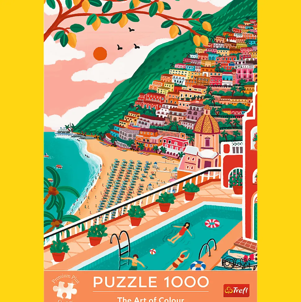 Puzzle Positano, Włochy, przedstawiają wakacyjny obraz włoskiego wybrzeża. Po ich ułożeniu powstanie obraz o wymiarach 683×480 mm.