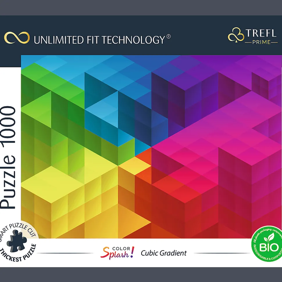 Puzzle z serii Trefl Prime UFT składające się z 1000 elementów są dedykowane prawdziwym miłośnikom układanek. Puzzle przedstawiają abstrakcyjny Cubic Gradient. Po ułożeniu powstanie obraz o wymiarach 683×480 mm.