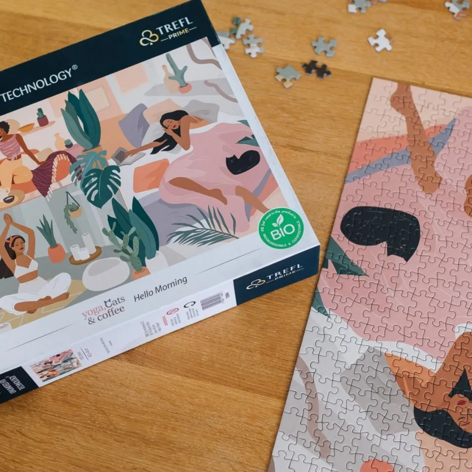 Puzzle z serii Trefl Prime UFT składające się z 1000 elementów są dedykowane prawdziwym miłośnikom układanek. Puzzle przedstawiają kobiecą codzienność w świecie jogi, kotów oraz kawy, czyli Hello Morning. Po ułożeniu powstanie obraz o wymiarach 683×480 mm.