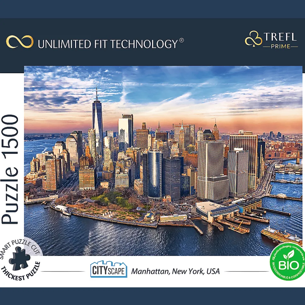 Puzzle z serii Trefl Prime Unlimited Fit Technology składające się z 1500 elementów są dedykowane prawdziwym miłośnikom układanek. Puzzle przedstawiają miasto Manhattan w Nowym Jorku. Po ułożeniu powstanie obraz o wymiarach 850×580 mm.