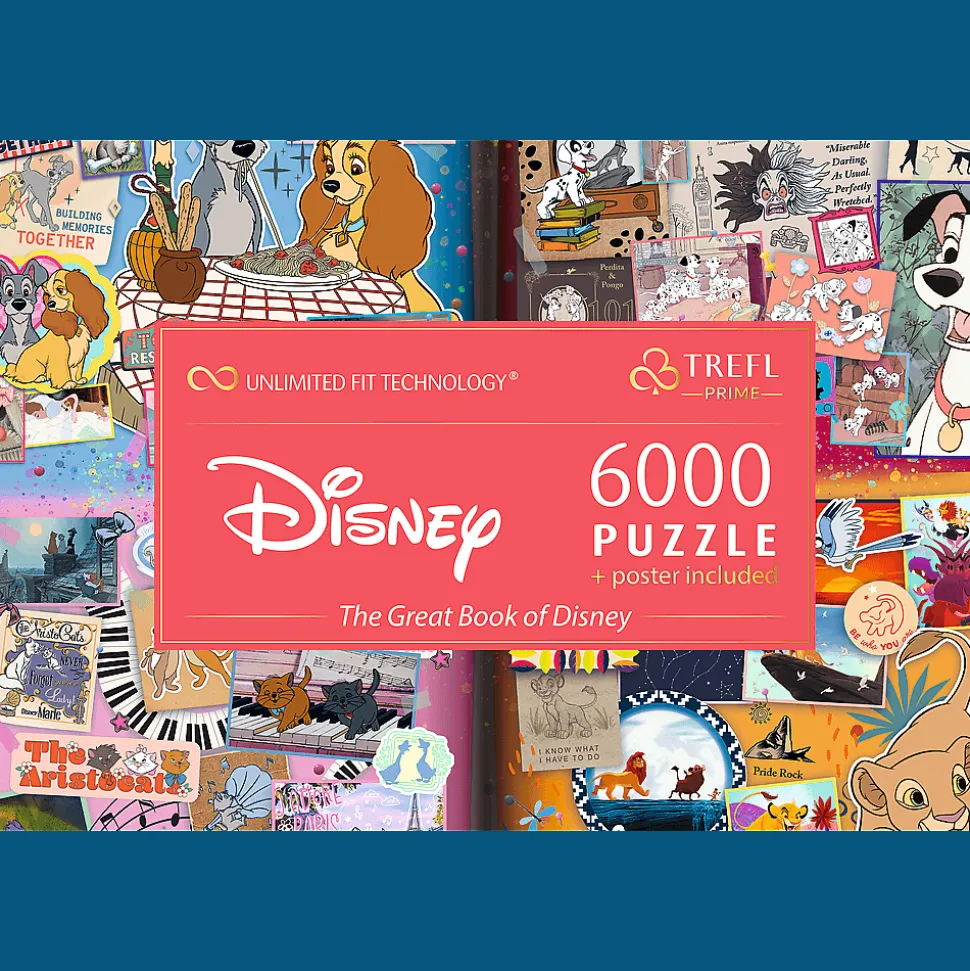 Odkryj puzzle Trefl Prime UFT – The Great Book of Disney, składające się z imponujących 6000 elementów! Ułóż kolaż przypominający strony z książki, na których znajdziesz bohaterów znanych bajek Disnea!
