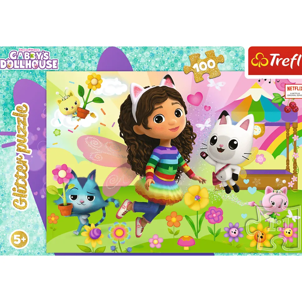 Brokatowa Gabby to puzzle z serii Glitter, składające się ze 100 elementów. Układanka została pokryta delikatnym, złotym brokatem, który sprawia, że zarówno opakowanie, jak i poszczególne elementy pięknie się mienią! Po ułożeniu puzzli powstanie obrazek o wymiarach 410×278 mm, który zachwyci wszystkich małych fanów bajki Koci Domek Gabi.