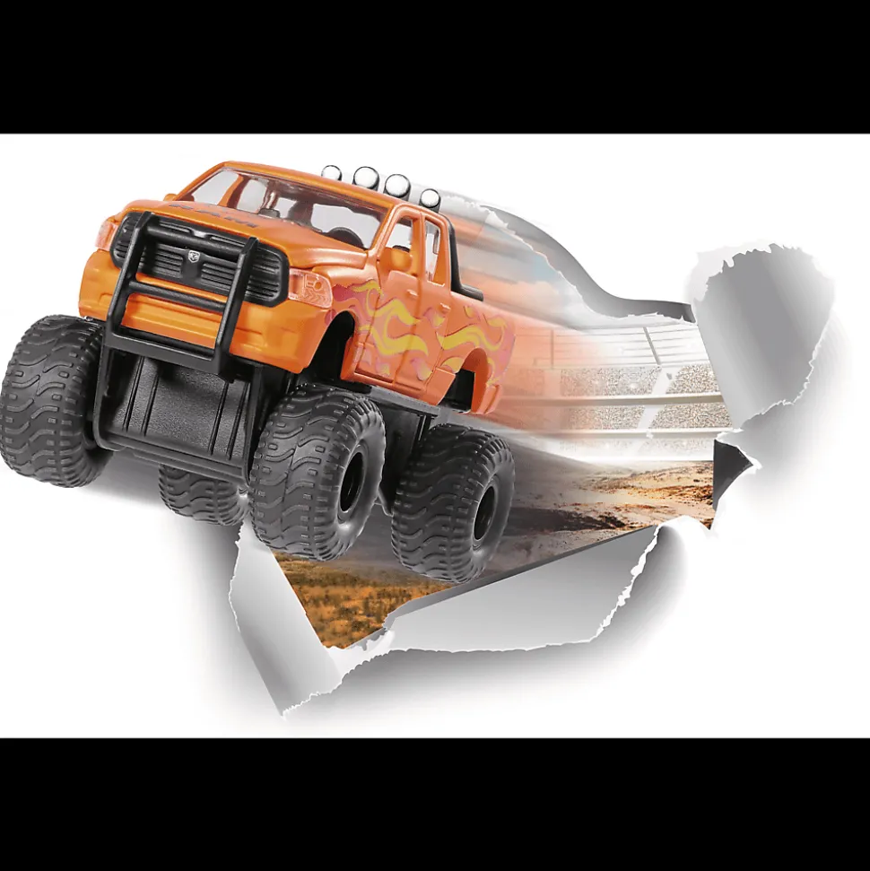 Na platformie ładunkowej umieszczono wspornik, do którego zamontowane jest oświetlenie z czterema reflektorami. Karoseria modelu Siku jest metalowa, a maskę, drzwi i klapę bagażnika można otwierać. Każda z osi jest indywidualnie resorowana, a koła są wymienne. W wariancie customowym z wysokim podwoziem w jaskrawopomarańczowym kolorze, z szczególnie grubymi i szerokimi oponami balonowymi RAM 1500 ma imponujący wygląd. Sprawdźcie!