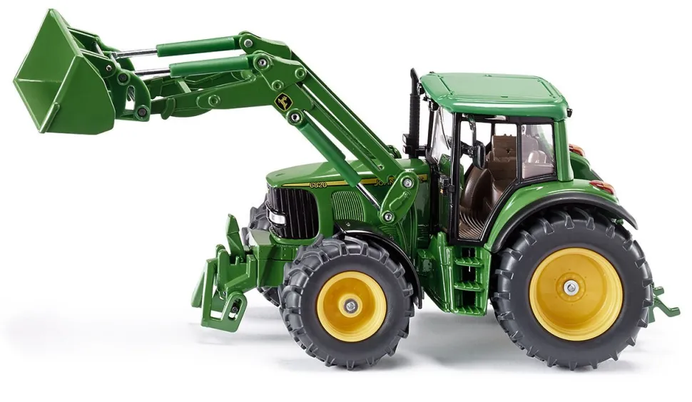 Ciągnik John Deere z przednią ładowarką. Model metalowy z elementami plastikowymi. Bardzo starannie wykonany z dbałością o wszelkie szczegóły.