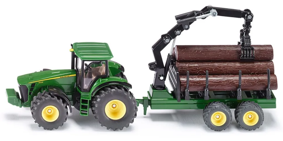 Zestaw składający się z ciągnika marki John Deere 8430 i przyczepy leśnej. Modele metalowe z elementami plastikowymi. Bardzo starannie wykonane z dbałością o wszelkie szczegóły.