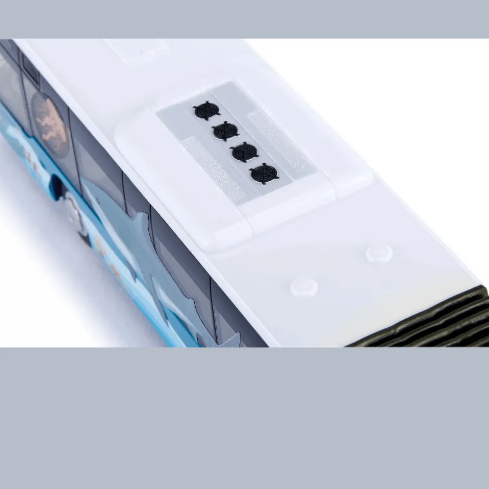 Model autobusu przegubowego MAN Lion’s City w skali 1:50 od SIKU to precyzyjnie wykonana replika rzeczywistego pojazdu. Wyróżnia się oszałamiającym odcieniem Miami blue, co nadaje mu wyjątkowy wygląd. Koła wyposażone w gumowane bieżniki oraz trzy osie (druga i trzecia z podwójnymi oponami) zapewniają autentyczność i stabilność modelu. Funkcjonalne drzwi po prawej stronie umożliwiają realistyczną zabawę, a otwierana klapa silnika z tyłu pozwala na podziwianie szczegółowego wnętrza. Dodatkowe elementy, takie jak przyciemniane szyby, oddzielne lusterka wsteczne, osłona chłodnicy oraz wysokiej jakości przednie i tylne światła z tworzywa sztucznego, podkreślają dbałość o detale. Na dachu znajdują się szczegółowe systemy klimatyzacji, odpowiadające oryginalnemu autobusowi. W zestawie znajdują się również dwa arkusze naklejek z motywami rekina i wody, umożliwiające personalizację modelu według własnych upodobań.