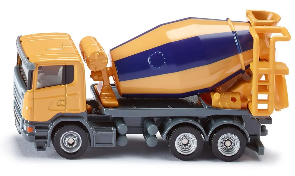 Metalowo-plastikowa betoniarka z serii Siku Super z obrotową ruchomą gruszką i gumowymi oponami zapewniającymi swobodne poruszanie po różnych powierzchniach. Model zachowuje szczegóły pojazdu rzeczywistego, skala 1:87.
