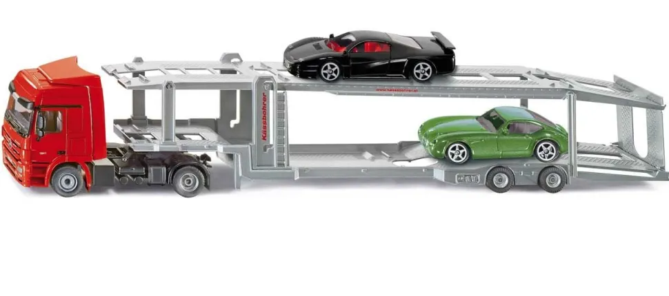 Model ciężarówki ze specjalną lawetą do przewozu aut, wykonany w skali 1:50 z zachowaniem szczegółów pojazdu rzeczywistego. Dostosowany do transportu 6 samochodów osobowych. Ruchome elementy lawety i odpowiedni kąt nachylenia zapewniają bezpieczny transport i załadunek pojazdów. Gumowe opony umożliwiają swobodne poruszanie się po różnych powierzchniach. Model jest doskonałym urozmaiceniem zabawy dla najmłodszych i atrakcyjną propozycją kolekcjonerską. W skład zestawu wchodzi ciężarówka i laweta – bez dodatkowych pojazdów widocznych na zdjęciu.
