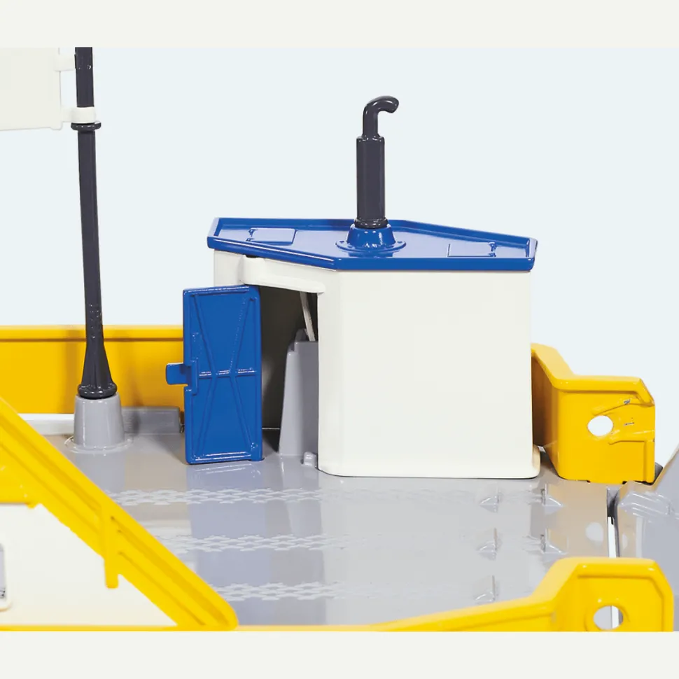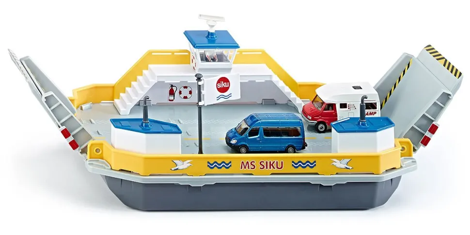 Plastikowy model promu, którym Twoje modele SIKU przekroczą każdą rzekę. Prom może pomieścić 6 samochodów osobowych lub 2 ciężarówki. Dwie opuszczane rampy ułatwiają załadunek samochodów na prom. Do promu dołączone są dwa modele samochodów.