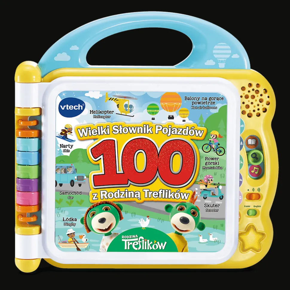 Wielki słownik pojazdów z Rodziną Treflików umila naukę języka angielskiego. Książka posiada 3 warianty zabawy: słownictwo, odkrywanie i zabawne dźwięki. Interaktywna zabawka pomaga poznać 100 nazw pojazdów i ciekawostek z nimi związanych w języku polskim oraz angielskim.