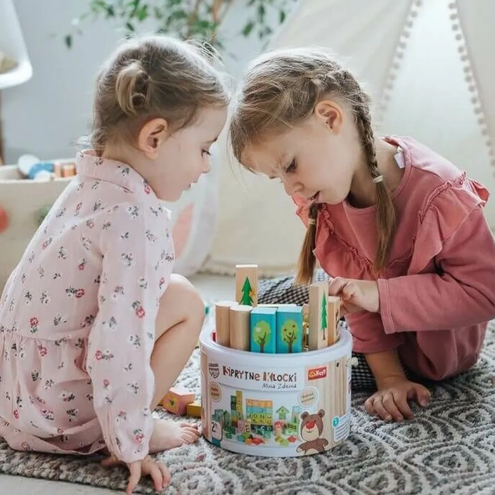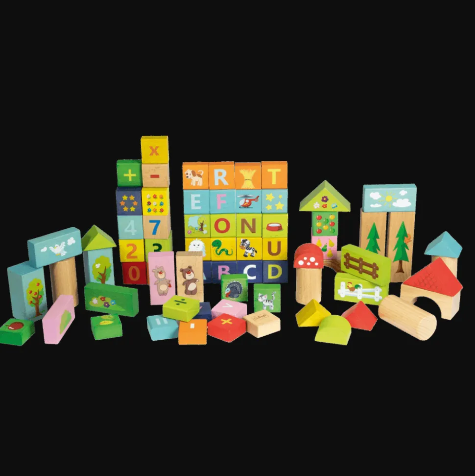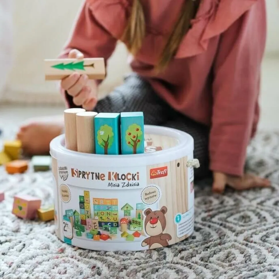 Edukacyjny zestaw 70 klocków o różnych kształtach, kolorach z cyferkami, literkami i piękną grafiką ze świata Misia Zdzisia. Wykonany z naturalnego drewna jest idealną zabawką ogólnorozwojową dla dzieci od 2 roku życia. W zestawie znajdują się m. in. dwustronne klocki – z jednej strony znajduje się literka lub cyferka, a z drugiej korespondujący z nią rysunek. Wszystkie materiały wykorzystane do stworzenia zabawki posiadają atesty, a także zostały pomalowane nietoksycznymi farbami.
