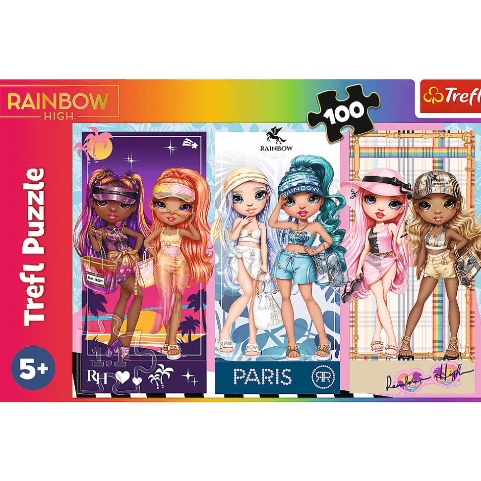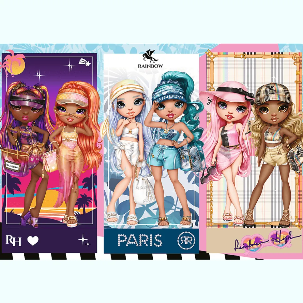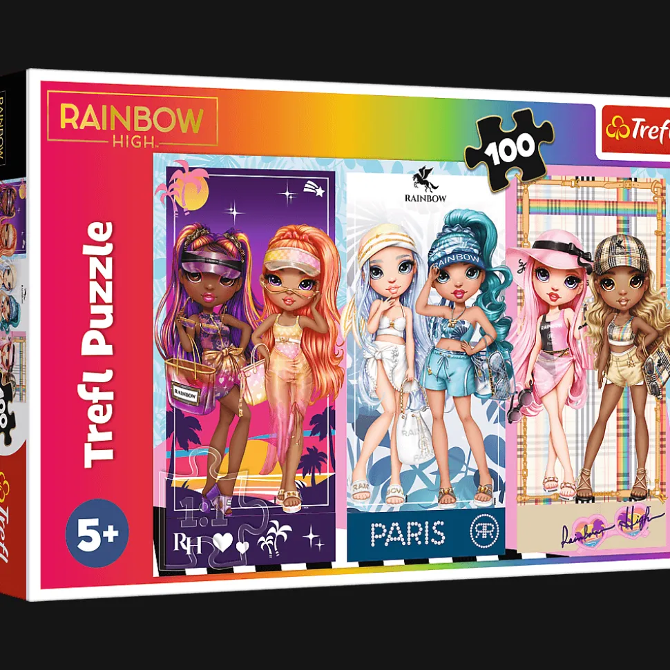 Tęczowe laleczki to puzzle składające się z 100 elementów z bohaterami bajki Rainbow High. Po ułożeniu powstanie obrazek o wymiarach 410×275 mm.