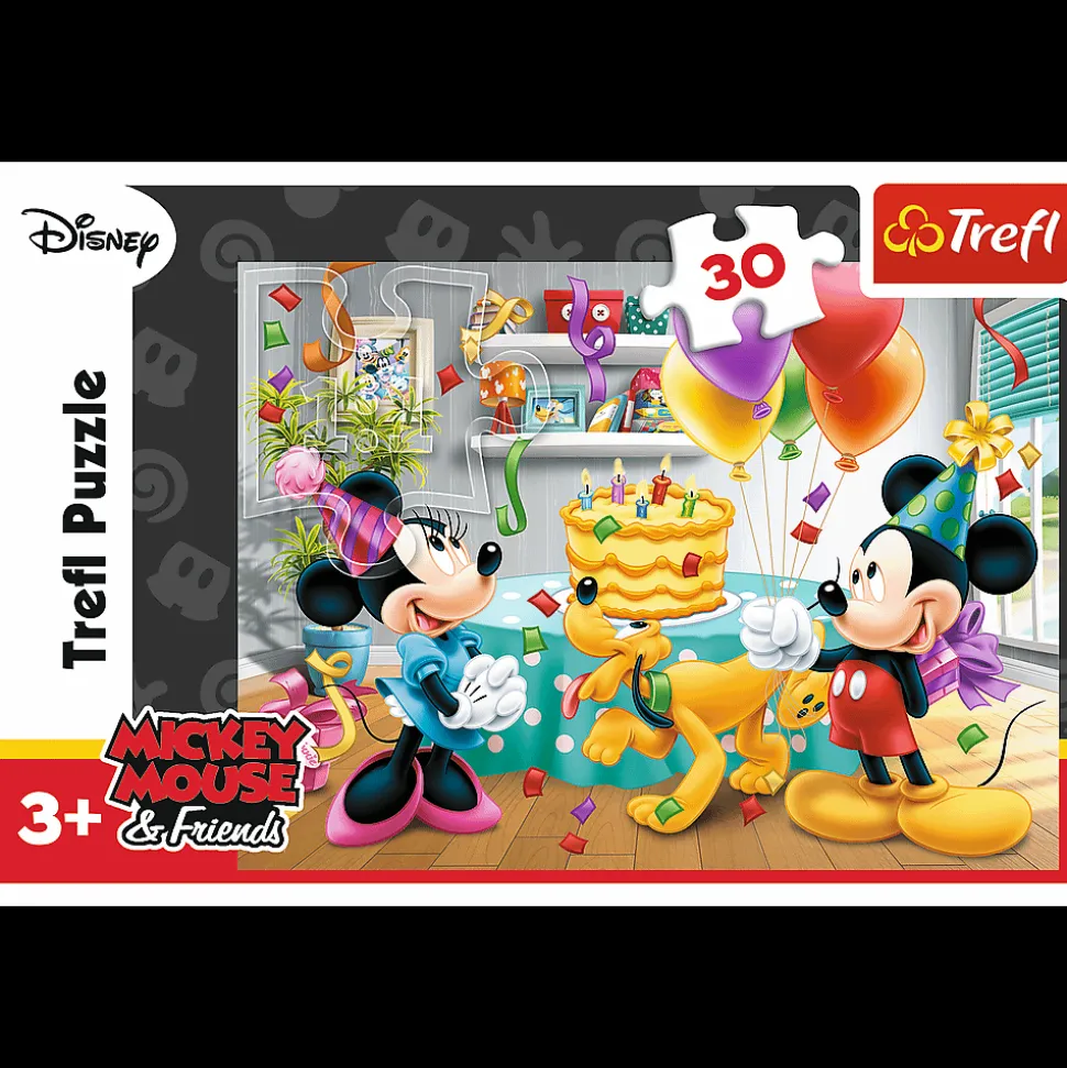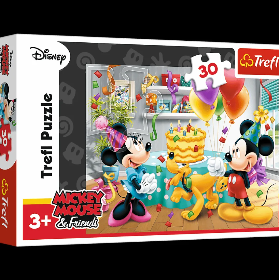 Puzzle 30 elementów z Mikim i Minnie na przyjęciu urodzinowym. Po ułożeniu powstanie obrazek o wymiarach 27×20 cm. Wysoką jakość, nasycenie kolorów i bezpieczeństwo układania zapewnia kalandrowany papier odbijający światło, pokryty ekologicznymi farbami spożywczymi.